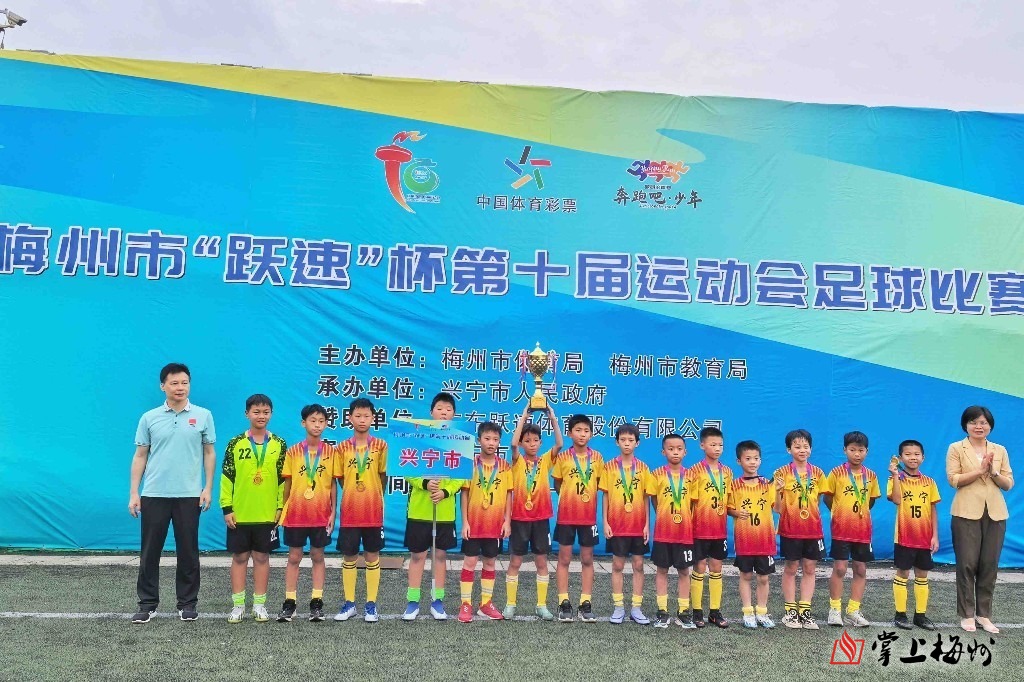 5月28日上午的女足E组决赛中,兴宁队凭借出色发挥,以1:0击败梅县区队,摘得冠军,成为本届市运会首枚金牌得主。梅县区队获得此次比赛亚军,梅江区队获得季军。此外,李佳、陈育良、郭雄、陈洪涛被授予“足球E组女子比赛优秀教练员”称号。同日下午,男足E组决赛激情上演,兴宁队以5:2战胜五华县队,登顶冠军领奖台,为兴宁代表团再添一金。五华县队、梅江区队在比赛中分别获亚军、季军。赛后,曾志标、丘志威、刘嘉祺、温冠锋被授予“足球E组男子比赛优秀裁判员”称号,张鹤仁、邱艺彬、李强、廖威被授予“足球E组男子比赛优秀教练员”称号。