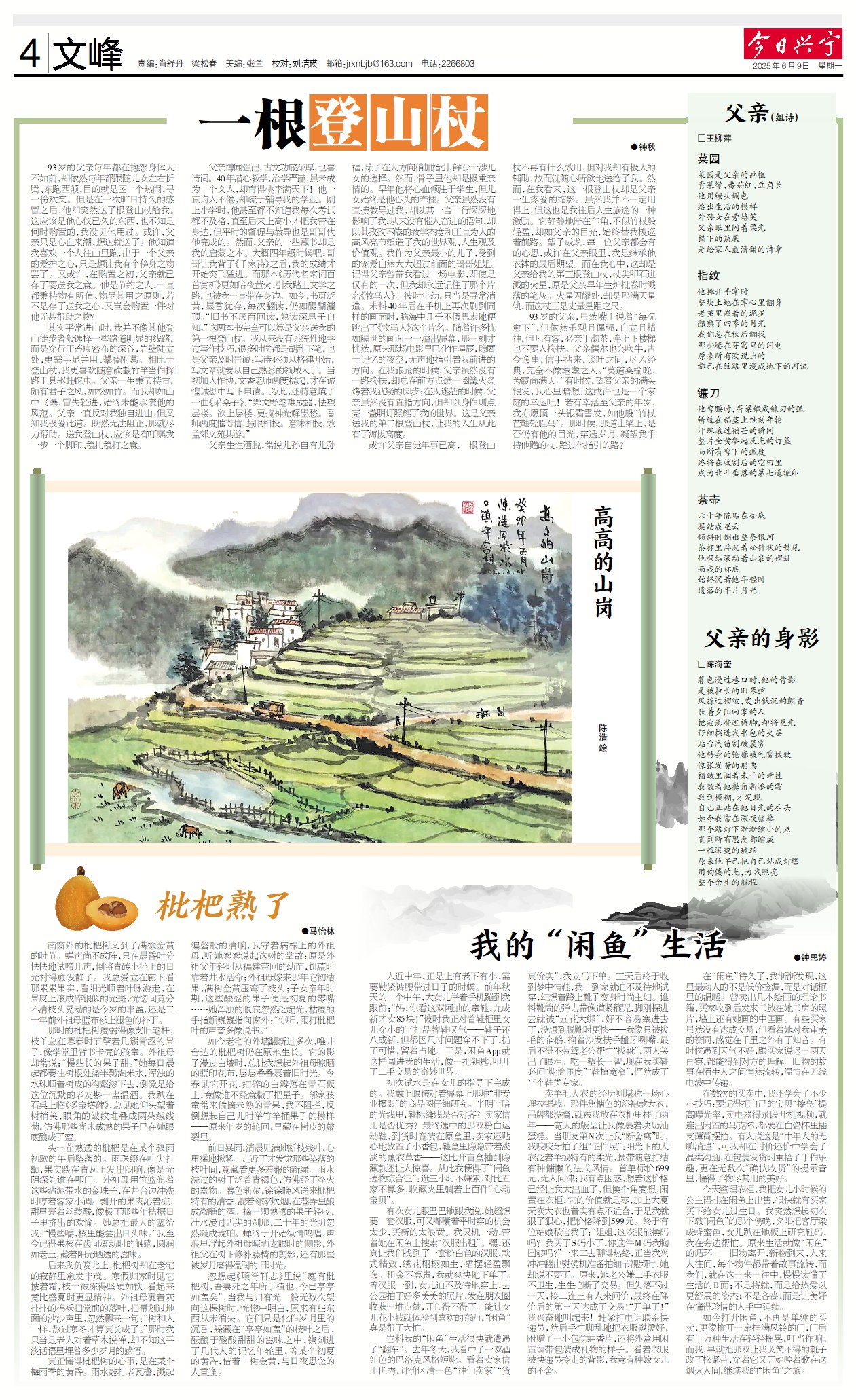 93岁的父亲,虽然嘴上说着“每况愈下”,但依然乐观且倔强,自立且精神,但凡有客,必亲手沏茶,连上下楼梯也不要人搀扶。父亲偶尔也会吹牛,古今逸事,信手拈来,谈吐之间,尽为经典,完全不像耄耋之人。“莫道桑榆晚,为霞尚满天。”有时候,望着父亲的满头银发,我心里暗想:这或许也是一个家庭的幸运吧!若有幸活至父亲的年岁,我亦愿顶一头银霜雪发,如他般“竹杖芒鞋轻胜马”。那时候,那道山梁上,是否仍有他的目光,穿透岁月,凝望我手持他赠的杖,踏过他指引的路?