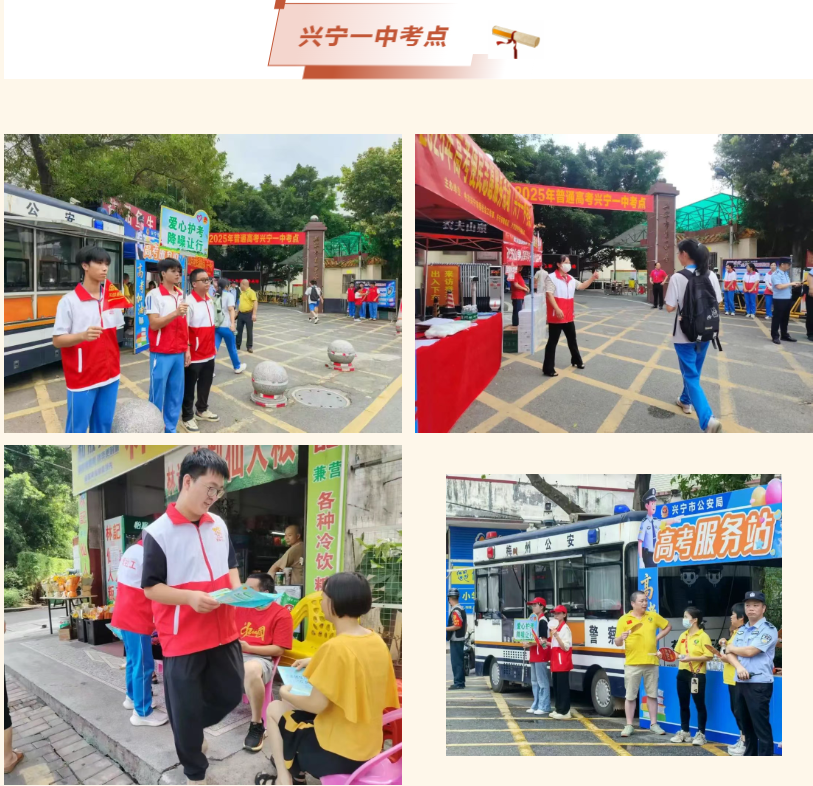 高考期间,考场内学子们奋笔疾书,考场外爱心服务温情涌动。20辆贴有“爱心护考”标识的专车穿梭于兴宁城区,通过“定点服务+线上预约”双模式,为考生提供免费接送服务,助力考生顺利赴考;在兴宁一中、沐彬中学、兴民中学、齐昌中学四大考点外,四个志愿服务点同步启用,110余名青年志愿者化身“护考使者”,在各服务点搭建了遮阳帐篷,配备了桌椅,免费提供矿泉水、应急药品、纸巾、雨具、扇子等物资,并设立休息区供考生及家长使用,以细致入微的服务传递城市温度。