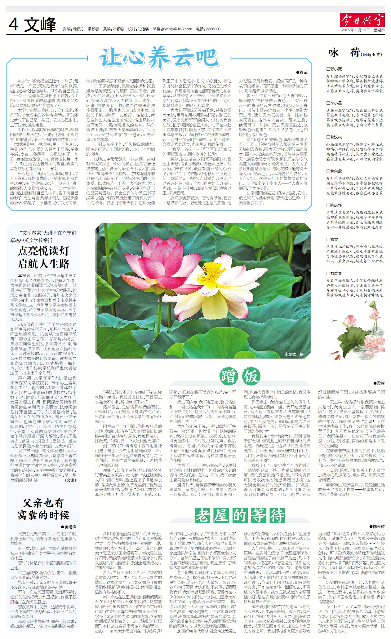 工作上,以满腔的爱雕刻时光,哪有闲暇来仰望天空。行走在校园,平视前方,耕耘讲台,像一个勇敢的拓荒者,一心一意倾注其中。生活中,用一寸明月心,举着火把,与心爱的人并肩于晨昏,举案齐眉,度着三餐四季。心里没有了一片云,生命随波逐流,小心翼翼捧起每一个日子,对生活表达着最深的敬意,真实的喜怒哀乐在尘世留下了指纹。