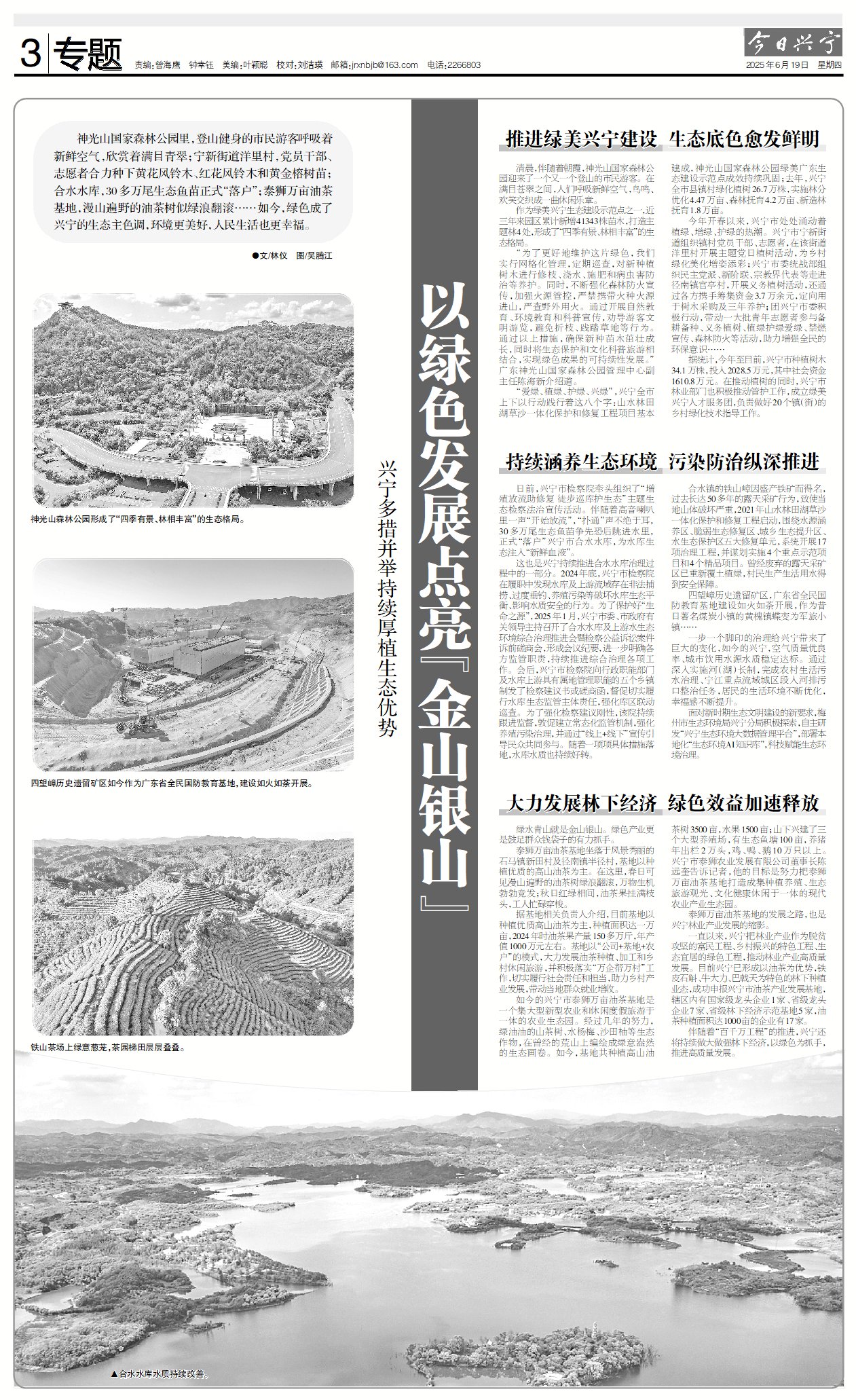 神光山国家森林公园里,登山健身的市民游客呼吸着新鲜空气,欣赏着满目青翠;宁新街道洋里村,党员干部、志愿者合力种下黄花风铃木、红花风铃木和黄金榕树苗;合水水库,30多万尾生态鱼苗正式“落户”;泰狮万亩油茶基地,漫山遍野的油茶树似绿浪翻滚……如今,绿色成了兴宁的生态主色调,环境更美好,人民生活也更幸福。