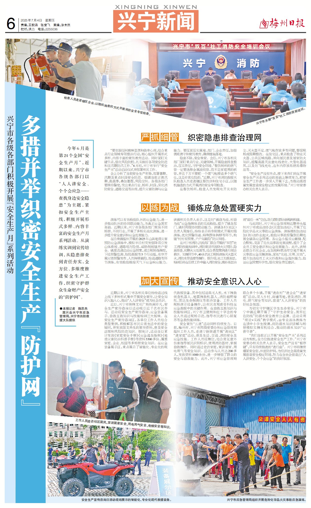 今年6月是第24个全国“安全生产月”,近期以来,兴宁市各级各部门以“人人讲安全、个个会应急——查找身边安全隐患”为主题,紧扣安全生产主线,积极开展形式多样、内容丰富的安全生产月系列活动。从演练实训到宣传培训,从隐患排查到责任夯实,全方位、多维度推进安全生产工作,织密守护群众生命财产安全的“防护网”。