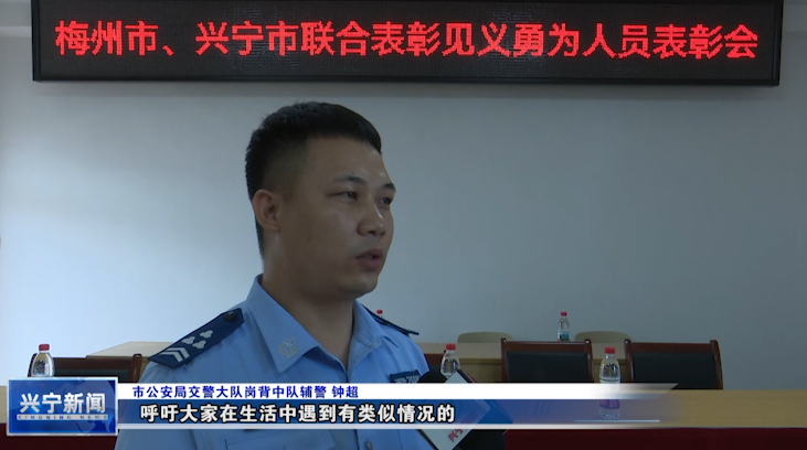 兴宁市公安局交警大队岗背中队辅警 钟超:“作为兴宁市公安局交警大队的一名辅警,在群众危难之际,我应该勇于担当。呼吁大家在生活中遇到有类似情况的,能帮忙就尽量帮忙,同时要注意自身安全。”