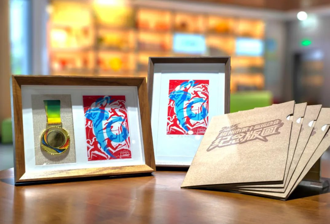 十运会主题版画由兴宁版画传承人邓威创作,将十运会会徽、神光山和运动元素相融合,迸发运动激情,展现东道主兴宁的文化魅力。主题版画还衍生出奖牌装裱摆件、版画摆件、版画纪念册等文创产品。