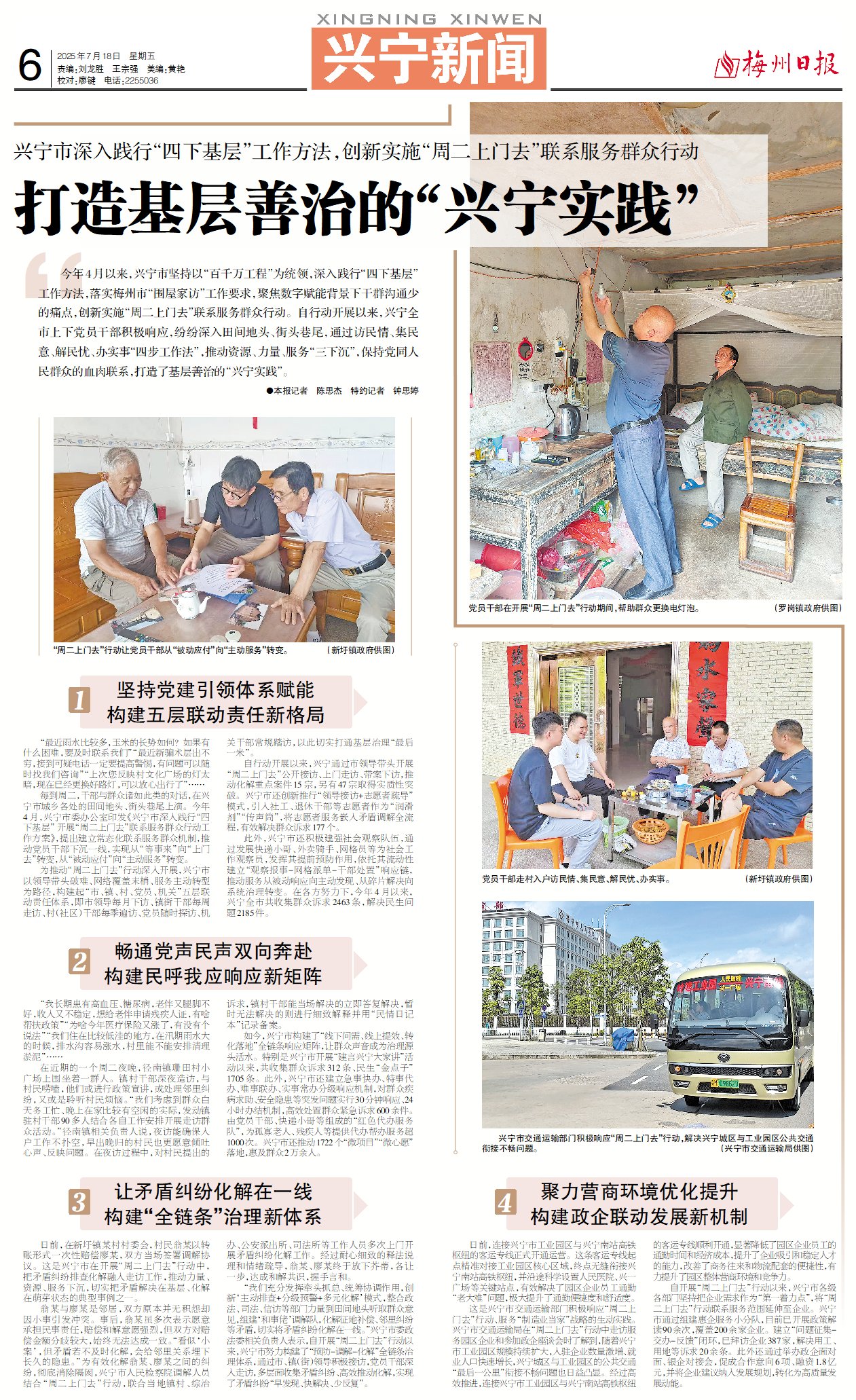 今年4月以来,兴宁市坚持以“百千万工程”为统领,深入践行“四下基层”工作方法,落实梅州市“围屋家访”工作要求,聚焦数字赋能背景下干群沟通少的痛点,创新实施“周二上门去”联系服务群众行动。自行动开展以来,兴宁全市上下党员干部积极响应,纷纷深入田间地头、街头巷尾,通过访民情、集民意、解民忧、办实事“四步工作法”,推动资源、力量、服务“三下沉”,保持党同人民群众的血肉联系,打造了基层善治的“兴宁实践”。
