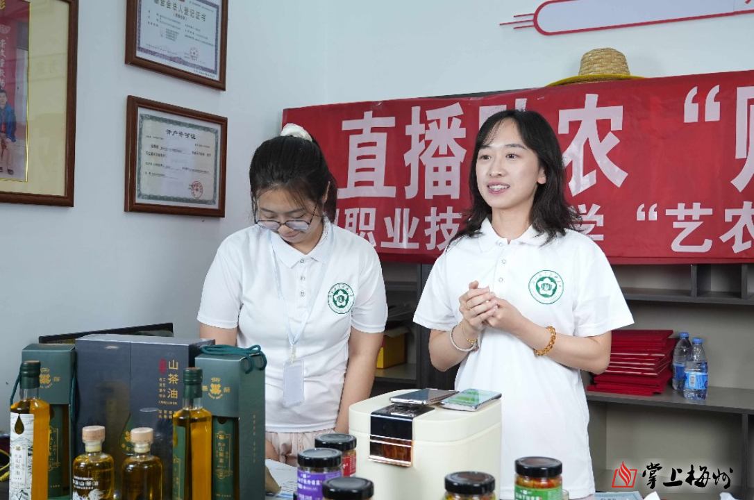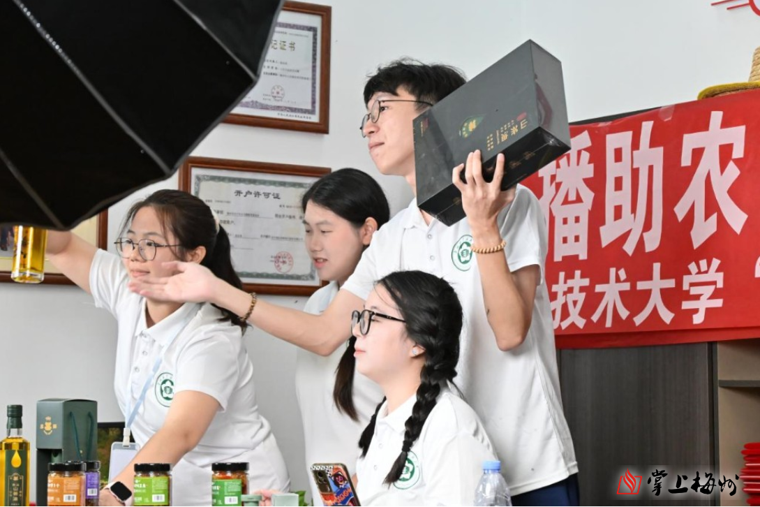 “家人们看!这是兴宁市石马镇独有的高山古法茶油,十六年老茶树籽榨取的头道茶油,被联合国粮农组织列为健康型高级食用植物油,不仅可以食用还可外用。”一场直播正在进行,学生们正绘声绘色地讲解着特色产品——兴宁市泰狮农业发展有限公司的山茶油。学生们运用实物讲解与现场操作相结合的形式,热情洋溢地向直播间观众详细介绍兴宁市石马泰狮古法山茶油的各项参数、口感与产品背后的故事。同时还通过现场试吃茶油下饭菜、实时互动为观众呈现了更清晰、更真实的直播效果。