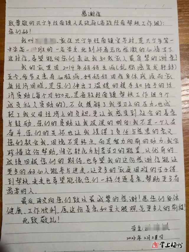 “教育帮扶先扶志,济困救难先助青”。家住径南镇社区的孙某是就读于兴宁市第一中学高一年级的困难学子,近期他以感谢信的方式向工作队全体成员表达内心的感激之情。