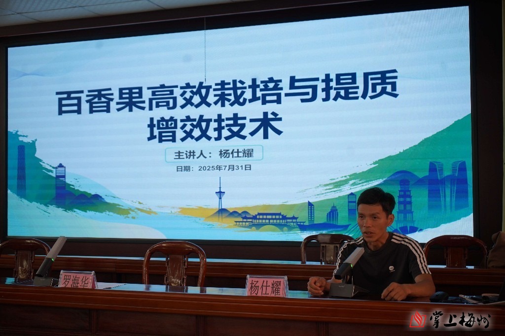 深耕百香果产业的梅州市虎竹农业科技有限公司负责人杨仕耀,则系统传授了高效栽培全流程技术。从抗病良种选育、科学建园规划,到规范育苗、水肥精准管理、绿色综合防控,再到优化定植密度与双主蔓整形修剪,为提升百香果品质与效益提供了清晰可行的方案。课堂上互动踊跃,专家们针对农户提出的生产难题逐一“开方”,既有理论高度又直击痛点,参训农户纷纷表示“收获满满”,对提升产量品质信心倍增。