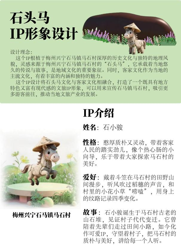 为了让这座沉睡的“镇村之宝”重焕生机,同学们开始了一场别开生面的文化唤醒行动。他们以“古石马”为灵感源泉,设计出萌态可掬的文旅IP“石小骏”。这个头戴客家凉帽、身披水墨纹样的小家伙,既保留了石马威武的神韵,又增添了亲切可人的气质。如今,这尊守望千年的石马化身美丽乡村的精神坐标,正以崭新的姿态继续守护乡土,在古今交响中见证乡土焕发新生!
