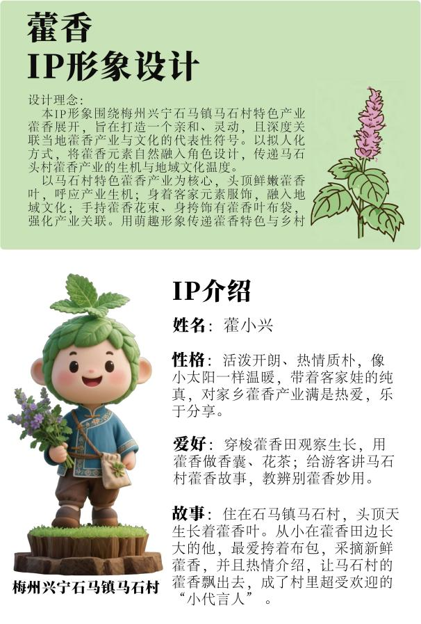 为让这份“绿叶奇迹”被更多人看见,同学们发挥创意,融合石马镇客家风情与藿香药用价值,打造了萌趣十足的产业IP“藿小兴”,它既承载着“建设美丽乡村”的美好寓意,又能生动地传播藿香文化。未来,“藿小兴”将化身马石村藿香产业的“代言人”,让传统产业焕发年轻活力。