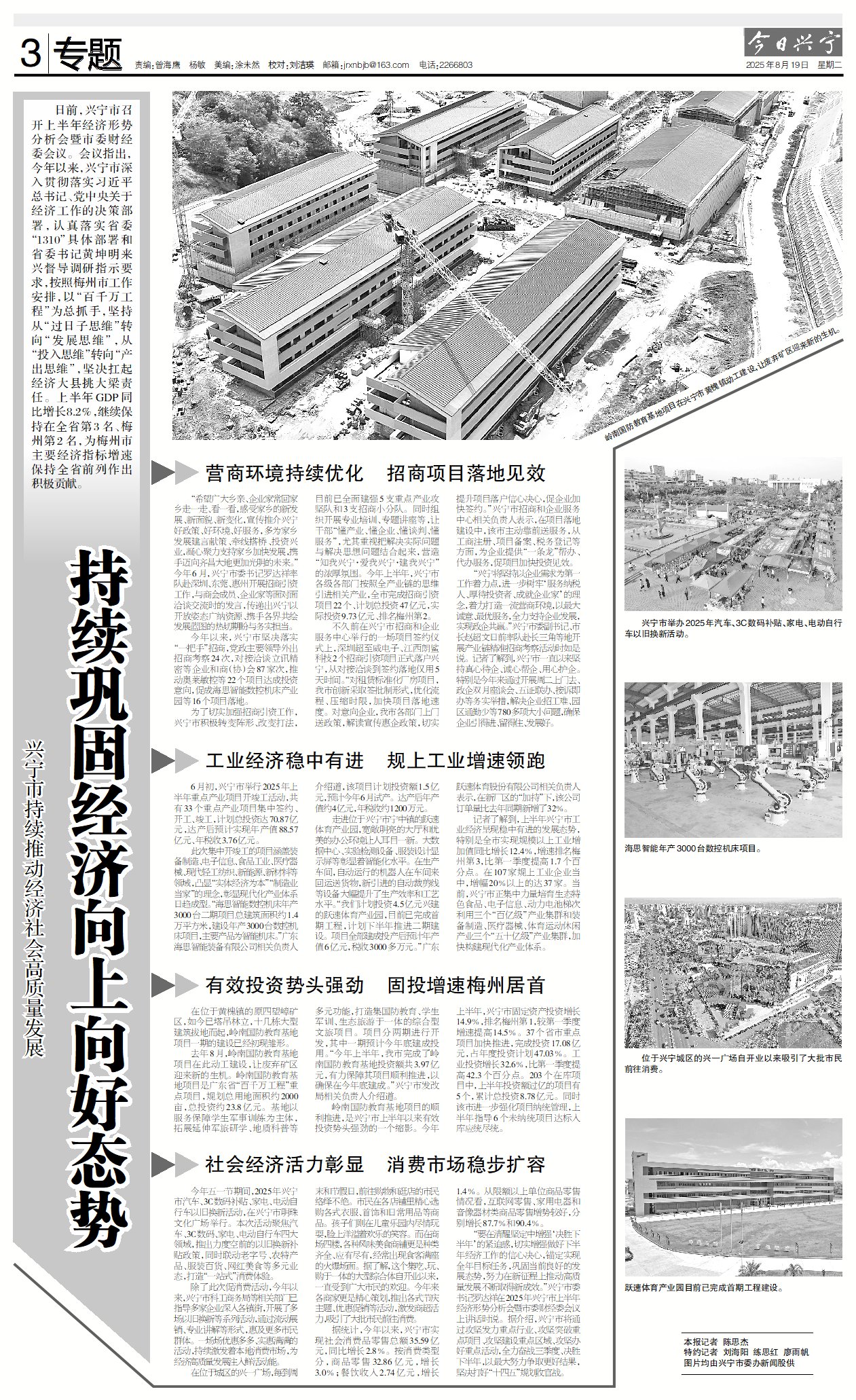 日前,兴宁市召开上半年经济形势分析会暨市委财经委会议。会议指出,今年以来,兴宁市深入贯彻落实习近平总书记、党中央关于经济工作的决策部署,认真落实省委“1310”具体部署和省委书记黄坤明来兴督导调研指示要求,按照梅州市工作安排,以“百千万工程”为总抓手,坚持从“过日子思维”转向“发展思维”,从“投入思维”转向“产出思维”,坚决扛起经济大县挑大梁责任。上半年GDP同比增长8.2%,继续保持在全省第3名、梅州第2名,为梅州市主要经济指标增速保持全省前列作出积极贡献。