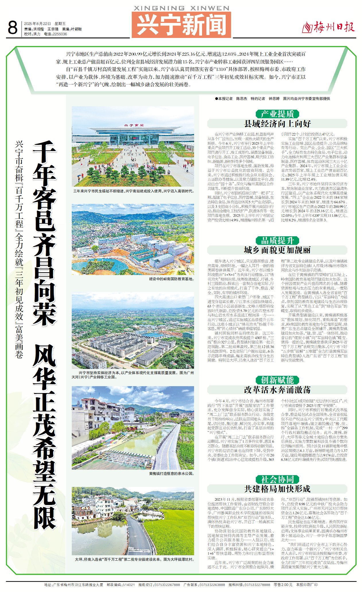 自“百县千镇万村高质量发展工程”实施以来,兴宁市认真贯彻落实省委“1310”具体部署,按照梅州市委、市政府工作安排,以产业为载体、环境为基础、改革为动力,加力提速推动“百千万工程”三年初见成效目标实现。如今,兴宁市正以“再造一个新兴宁”的气魄,绘制出一幅城乡融合发展的壮美画卷。