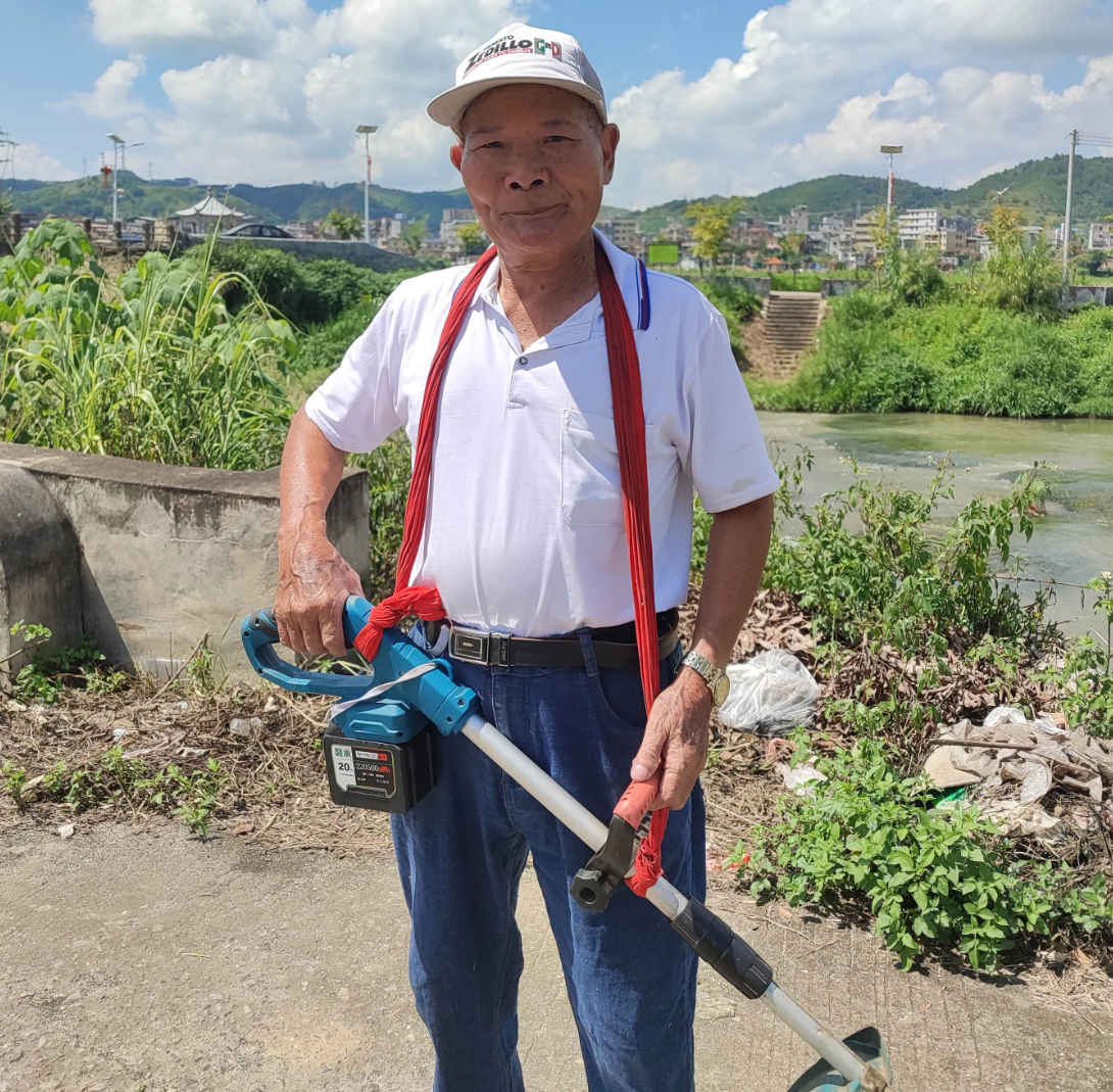 9月13日上午,笔者在寺岗村的文革桥边见到了正在劳作的钟春木。他头戴白色太阳帽,动作利落地从摩托车上取下工具——割草机、铁铲、扫帚和刷斗一应俱全。尽管年事已高,他仍精神矍铄地操作割草机清理路边杂草,随后俯身扫地、铲除垃圾,一气呵成。