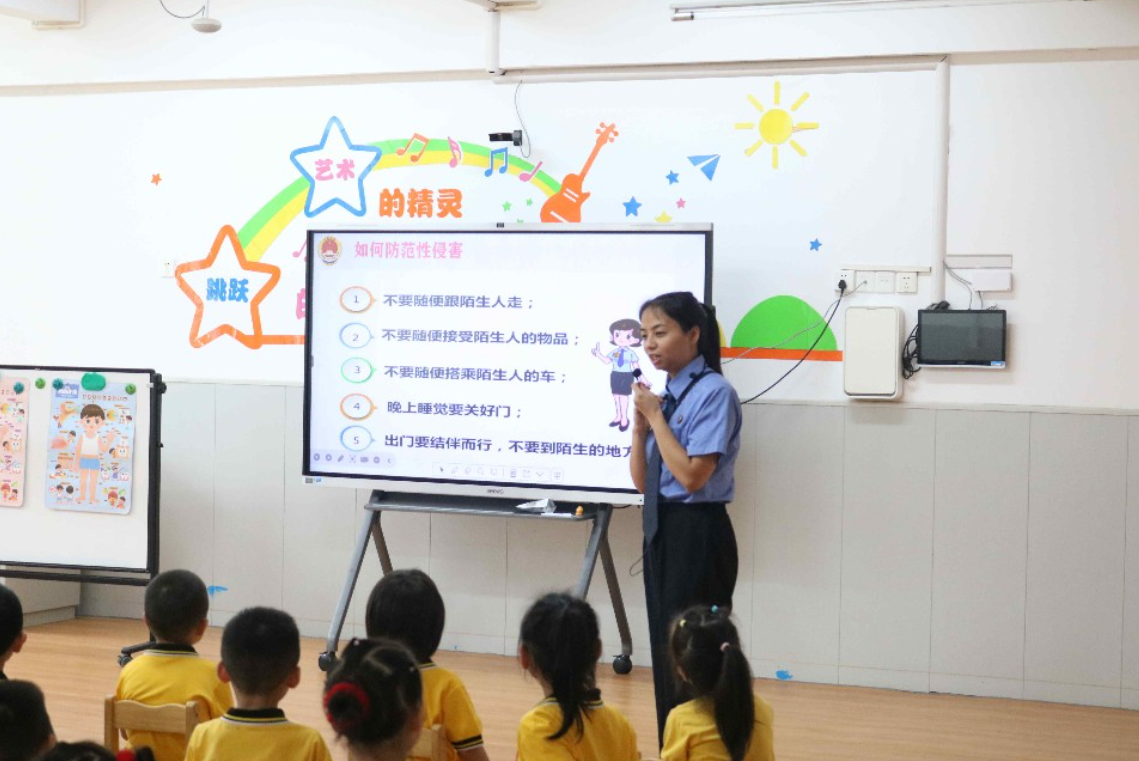 “在小区游乐场玩时,陌生叔叔走过来给你棒棒糖,还说要带你去动物园玩,你该怎么做?”“妈妈出门买菜,留你一个人在家,这时有人敲门,你怎么办?”在兴宁市宁新中心幼儿园的“防拐骗、防性侵”趣味安全课堂上,针对幼儿认知特点,检察干警用朗朗上口的儿歌,配合“陌生人拿玩具、零食引诱”等情景模拟,引导60名幼儿在轻松愉快氛围中知悉“不吃陌生人糖果”“不随陌生人离开”等基本自护要领,以及“明确告知父母就在附近”“打电话告诉父母家里发生的事情”“向执勤的交警叔叔问路”等防骗招数。同时,检察干警还引导幼儿建立身体界限意识,学会区分“爱的抚摸”与“坏的触碰”,鼓励幼儿勇敢向不当行为说“不”。