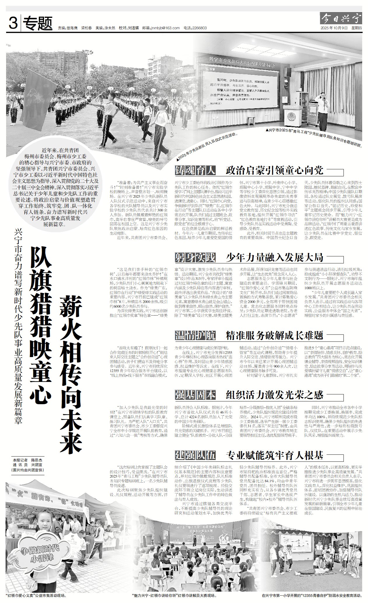 近年来,在共青团梅州市委员会、梅州市少工委的精心指导与兴宁市委、市政府的坚强领导下,共青团兴宁市委员会、兴宁市少工委以习近平新时代中国特色社会主义思想为指导,深入贯彻党的二十大及二十届三中全会精神,深入贯彻落实习近平总书记关于少年儿童和少先队工作的重要论述,将政治启蒙与价值观塑造贯穿工作始终,筑牢党、团、队一体化育人链条,奋力谱写新时代兴宁少先队事业高质量发展新篇章。