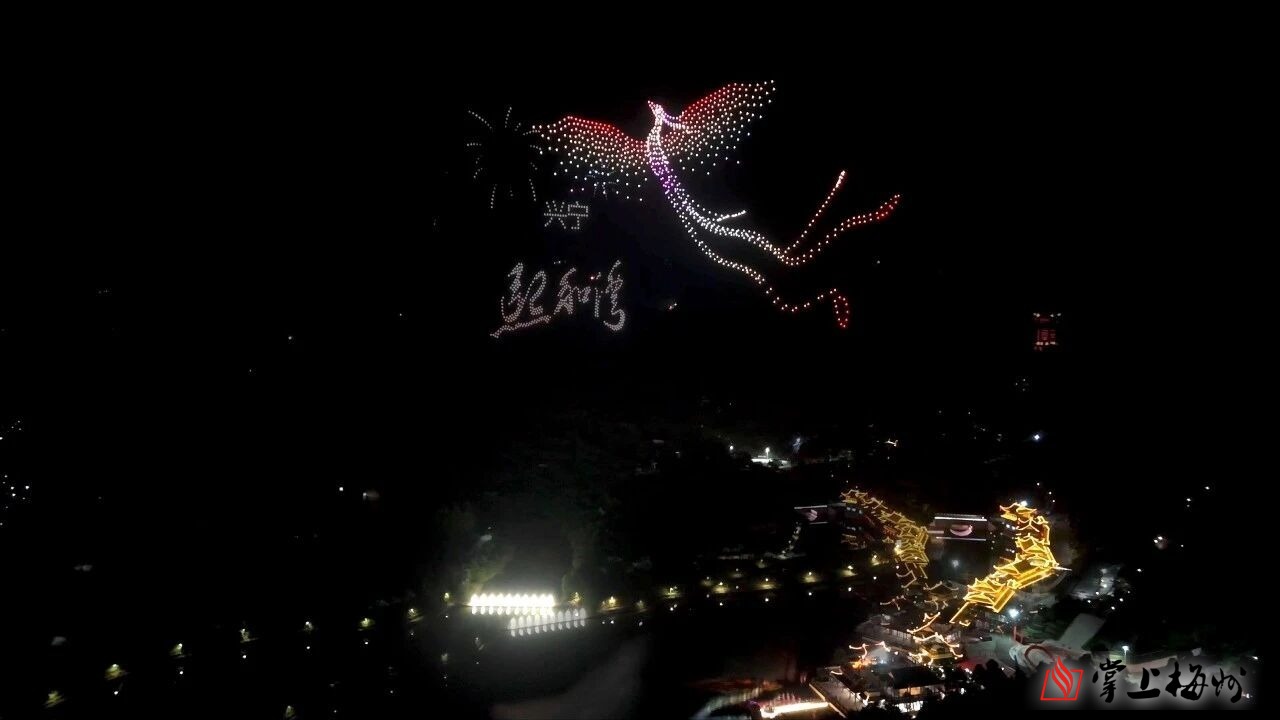 10月1日,升级改造后的兴宁熙和湾客乡文化旅游产业园正式焕新开园,以全新面貌迎接八方游客,吸引众多市民游客前来打卡。夜幕下,景区灯光璀璨,千架无人机腾空而起,在空中变幻出“国庆快乐”“花灯”“凤凰”等绚丽图案,引得游客纷纷举起手机抓拍;花灯楼的灯光与激光秀交相辉映,光影洒在凤栖湖面上,营造出梦幻氛围;游船码头上,乐队演唱《向阳花》《蓝莲花》、舞蹈表演《花开盛世》《长绸扇舞》等节目轮番上演,为游客带来全方位的视听盛宴。