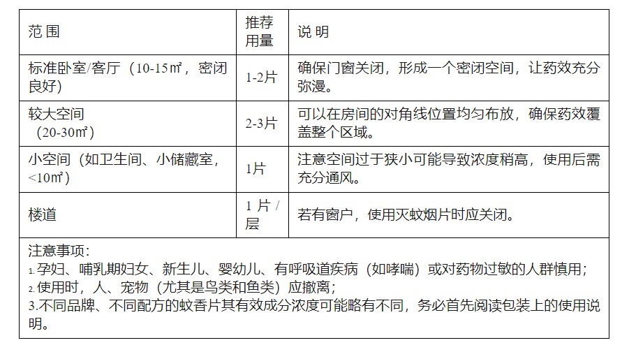 二、用量:计算室内空间大小,按说明书用量使用。比如:某某牌灭蚊烟片,20平米空间/2片,适用范围和推荐用量如下:
