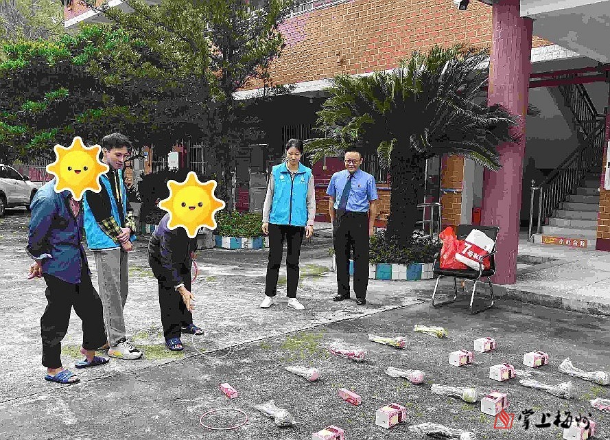 活动当天,敬老院小广场上暖意融融,趣味套圈活动率先拉开序幕。老人们站在指定位置,手拿彩色圈套,瞄准早已摆放好的纸巾、艾草锤等小礼品,身体前倾、手臂一挥,将圈套抛向心仪物品,每一次获得“战利品”都伴随着阵阵欢呼声。