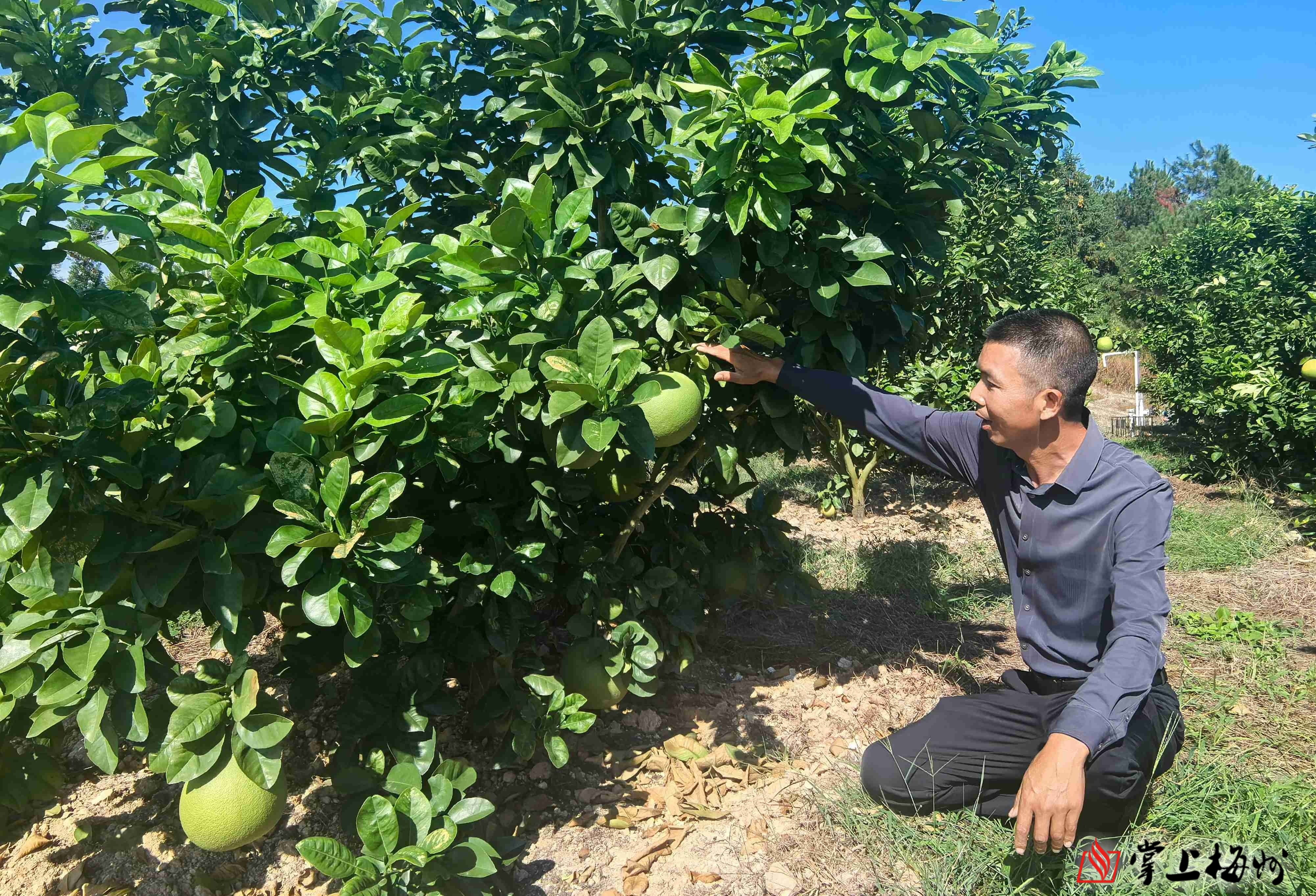 刘道怀在柚园查看柚果长势,他的种植基地已带动周边200多户农户就业增收。(陈思杰 摄)