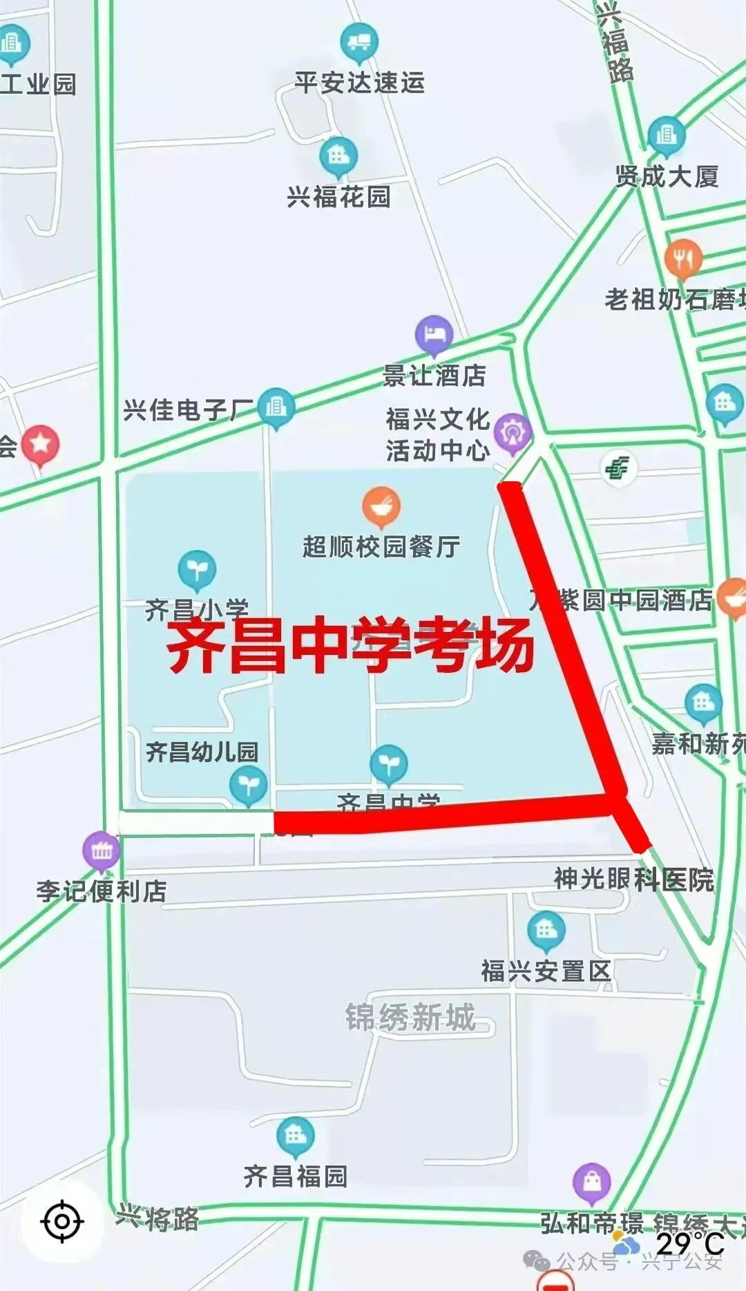 ▲齐昌中学考场周边红色路段为临时交通管制路段▲