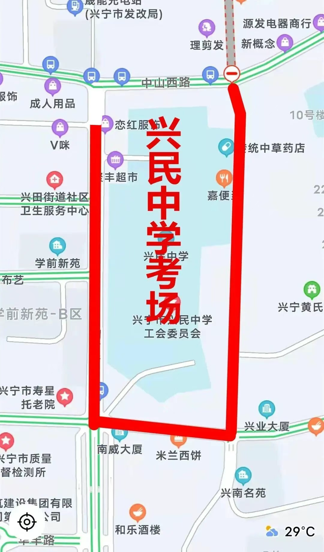 ▲兴民中学考场周边红色路段为临时交通管制路段▲