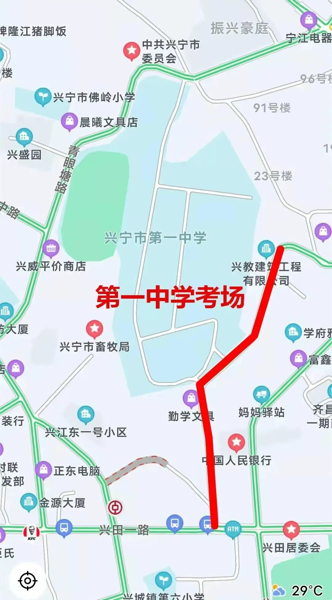▲兴宁市第一中学考场周边红色路段为临时交通管制路段▲