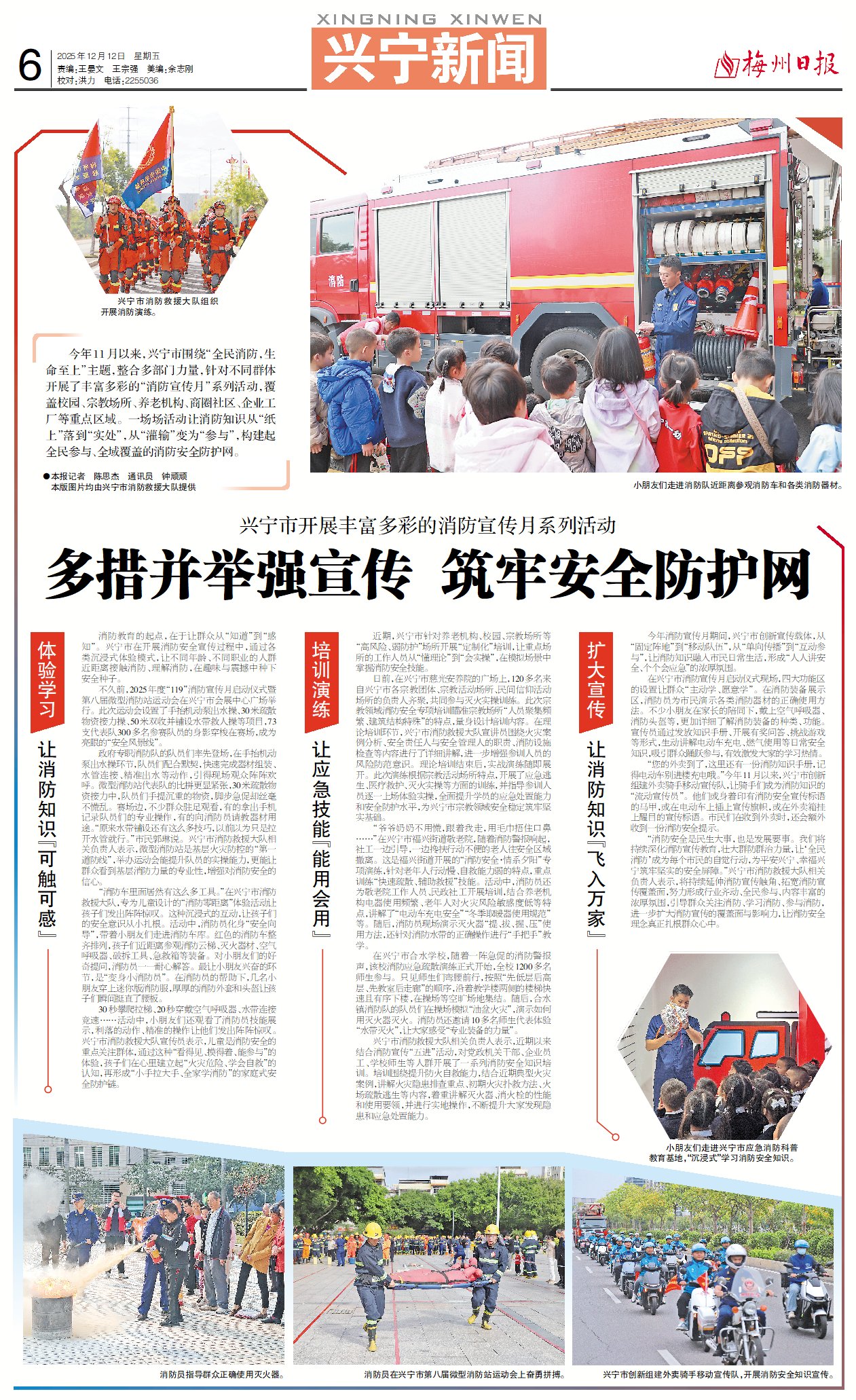 “消防安全是民生大事,也是发展要事。我们将持续深化消防宣传教育,壮大群防群治力量,让‘全民消防’成为每个市民的自觉行动,为平安兴宁、幸福兴宁筑牢坚实的安全屏障。”兴宁市消防救援大队相关负责人表示,将持续延伸消防宣传触角、拓宽消防宣传覆盖面,努力形成行业齐动、全民参与、内容丰富的浓厚氛围,引导群众关注消防、学习消防、参与消防,进一步扩大消防宣传的覆盖面与影响力,让消防安全理念真正扎根群众心中。