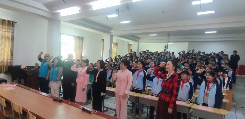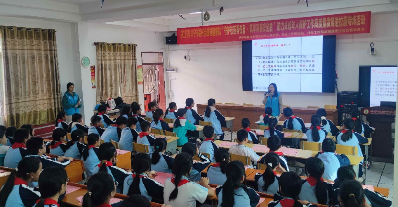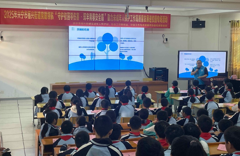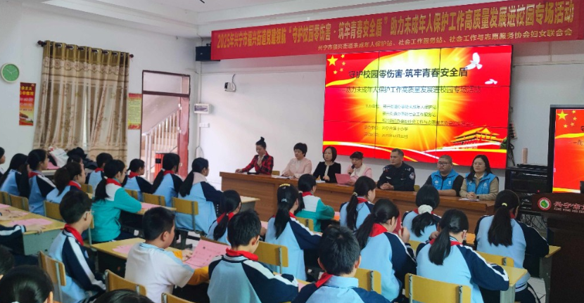 日前,兴宁市福兴街道党工委、办事处组织该街道未成年人保护工作站、社会工作服务站、社会工作与志愿服务协会妇女联合会,以“守护校园零伤害,筑牢青春安全盾”为主题,走进兴宁市第十小学举办助力未成年人保护工作高质量发展进校园专场活动。福兴街道党群服务中心主任朱冬梅、福兴派出所警官陈均文,兴宁市第十小学校长饶芳、副校长曾晓燕、德育处主任曾小英,以及145名学生参加。