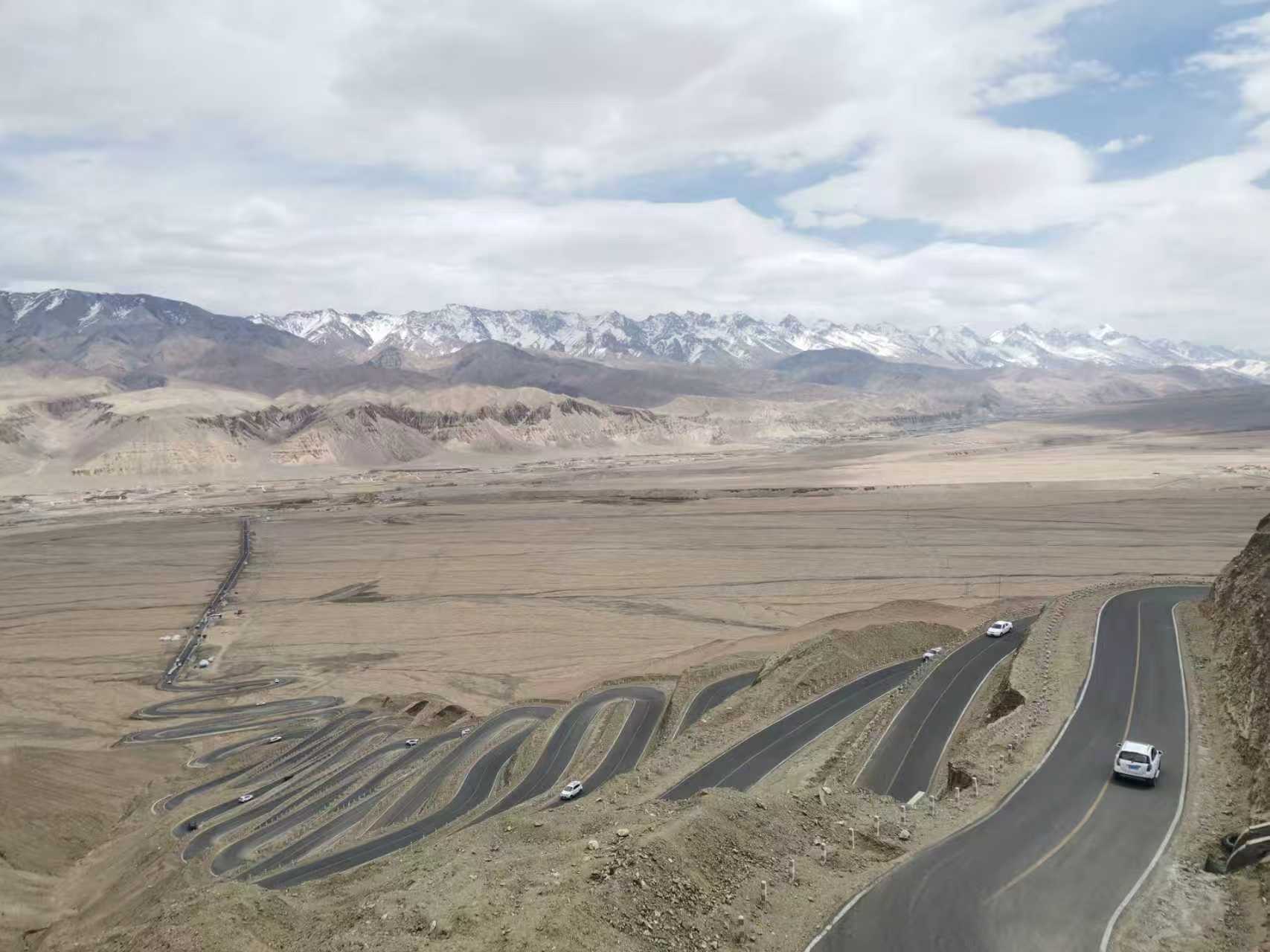 随后,我们前往盘龙古道。这条位于塔县瓦恰乡的盘山公路,是乡民通往县城的“致富路”。它蜿蜒于昆仑山脉,全程竟有600多个S弯,海拔约4100米,远望如巨龙盘卧山间,守护着西部神山。因路途险峻且易引起高反,多数游客只走一半便原路返回。我们却决定全程体验。车行迂回曲折,大家不免提心吊胆,幸而司机技术娴熟、经验丰富,才稍感安心。行至海拔约4500米的半山腰,道路右上方有一大片未融积雪,我们临时起意停车玩雪。可没走几步,我和女儿便感到寒冷刺骨、呼吸艰难——典型的高原反应,只好作罢返回。几位体质较好的同伴却尽兴赏雪、拍照,还登上一处山顶,远眺高原苍茫奇景。