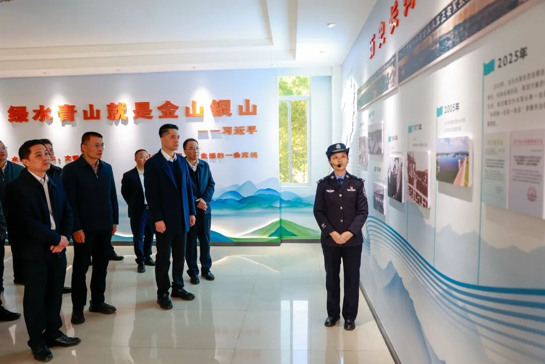 赵超文一行首先前往参加合水水库生态治理中心(生态警务联勤共治中心)揭幕仪式。活动上,赵超文、黄伟军、罗国强和兴宁市水务局负责人共同为合水水库生态治理中心揭牌。据了解,为深化生态保护、创新社会治理、筑牢饮水安全防线,兴宁市公安局会同市水务局、生态环境局、农业农村局、自然资源局、林业局及合水镇政府等单位,全力推进合水水库生态治理中心建设,投入60多万元对办公场所进行全面升级改造,初步构建了“统一指挥、联动调度、协同处置”的运作框架,探索建立了线索流转、联合执法的工作机制。中心的正式启用,标志着我市生态治理工作迈入了系统化、科学化、规范化的新阶段。