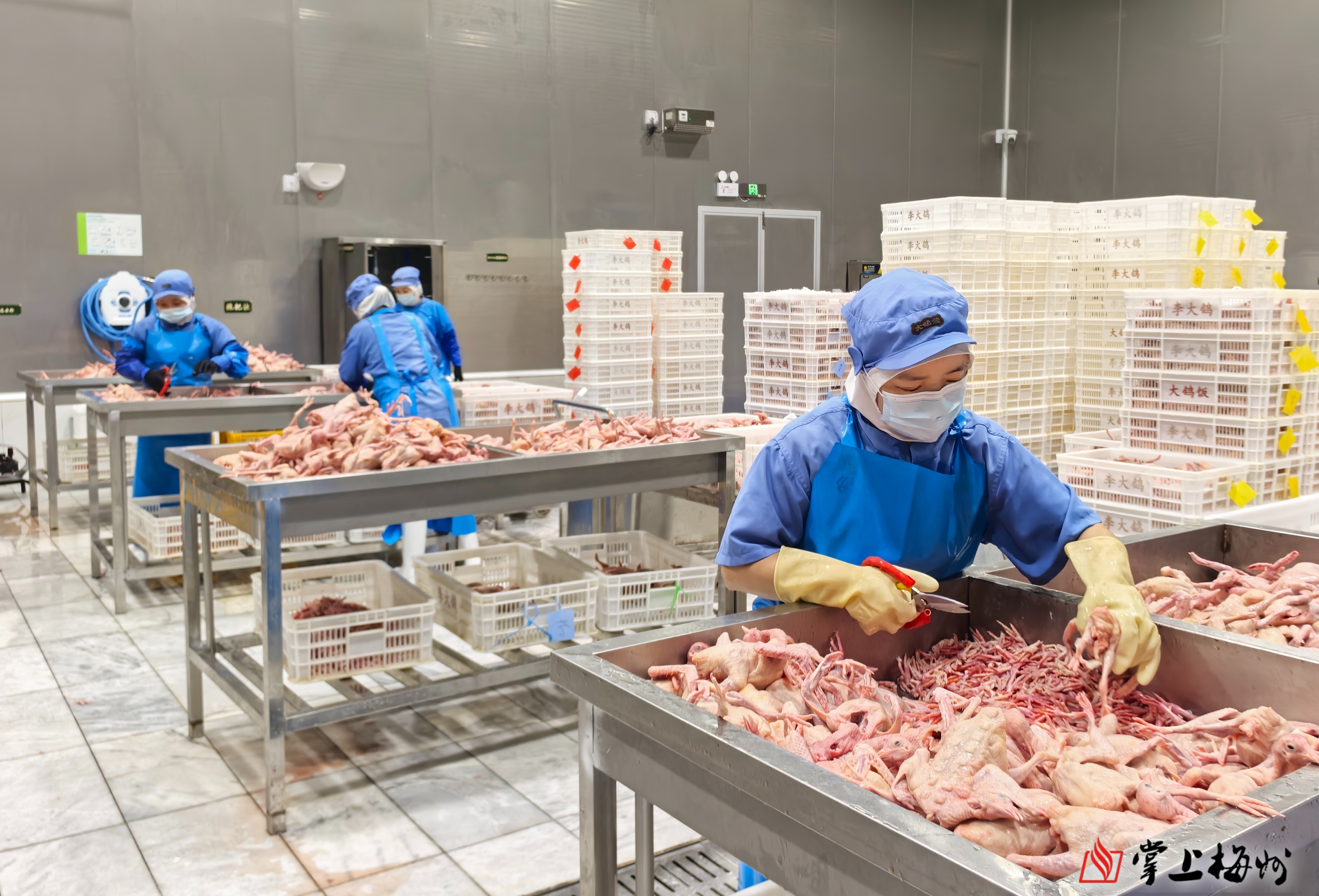 走进金绿公司位于兴宁产业园的现代化加工厂房,25天龄乳鸽经过沥血、脱毛、分级等18道标准化工序,变身冰鲜鸽或预制菜,通过冷链物流发往全国各地。