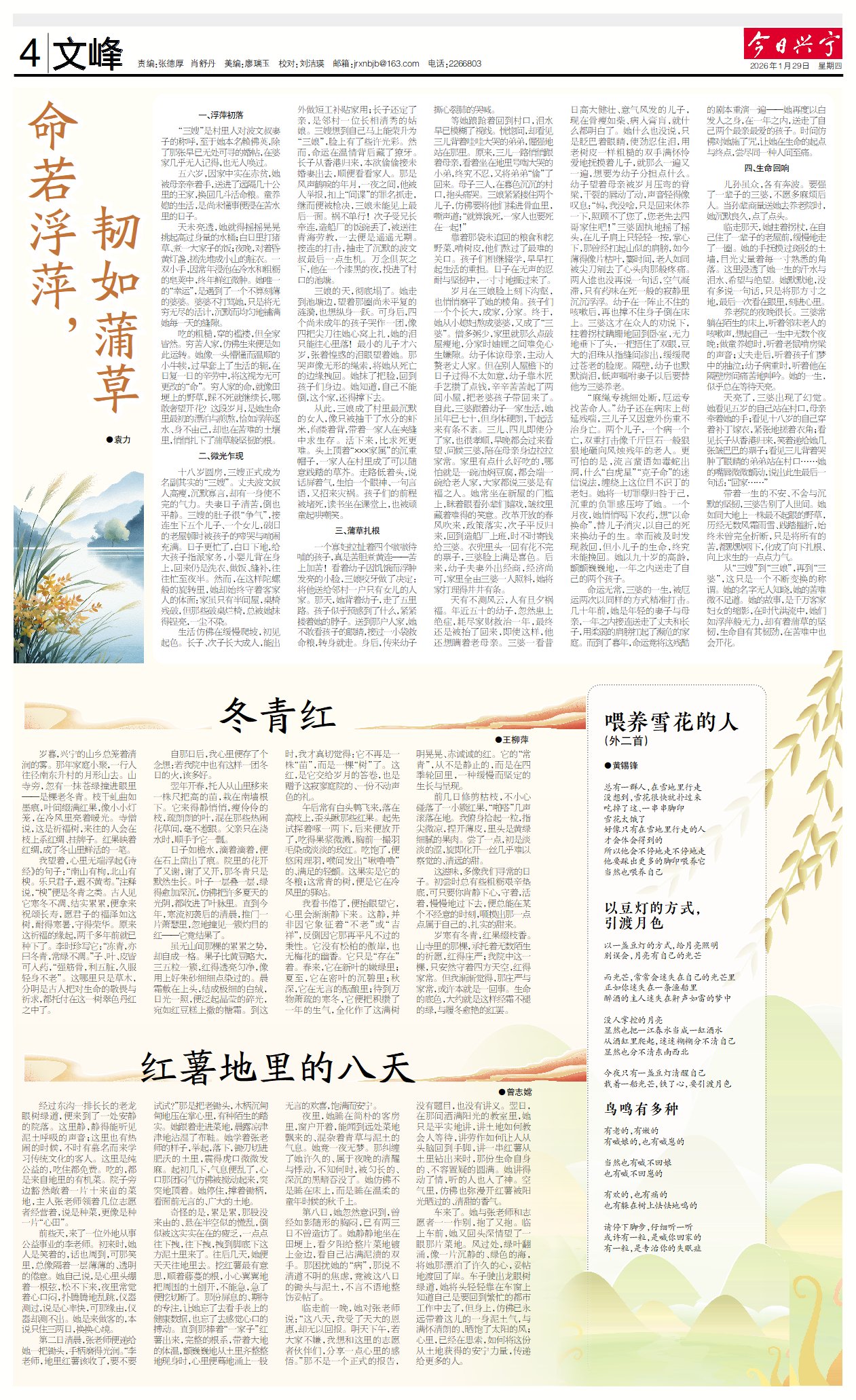 吃的粗糙,穿的褴褛,但全家皆然。穷苦人家,仿佛生来便是如此运转。她像一头懵懂而温顺的小牛犊,过早套上了生活的轭,在日复一日的辛劳中,将这视为无可更改的“命”。穷人家的命,就像田埂上的野草,踩不死就继续长,哪敢奢望开花?这段岁月,是她生命里最初的漂泊与煎熬,恰如浮萍逐水、身不由己,却也在苦难的土壤里,悄悄扎下了蒲草般坚韧的根。