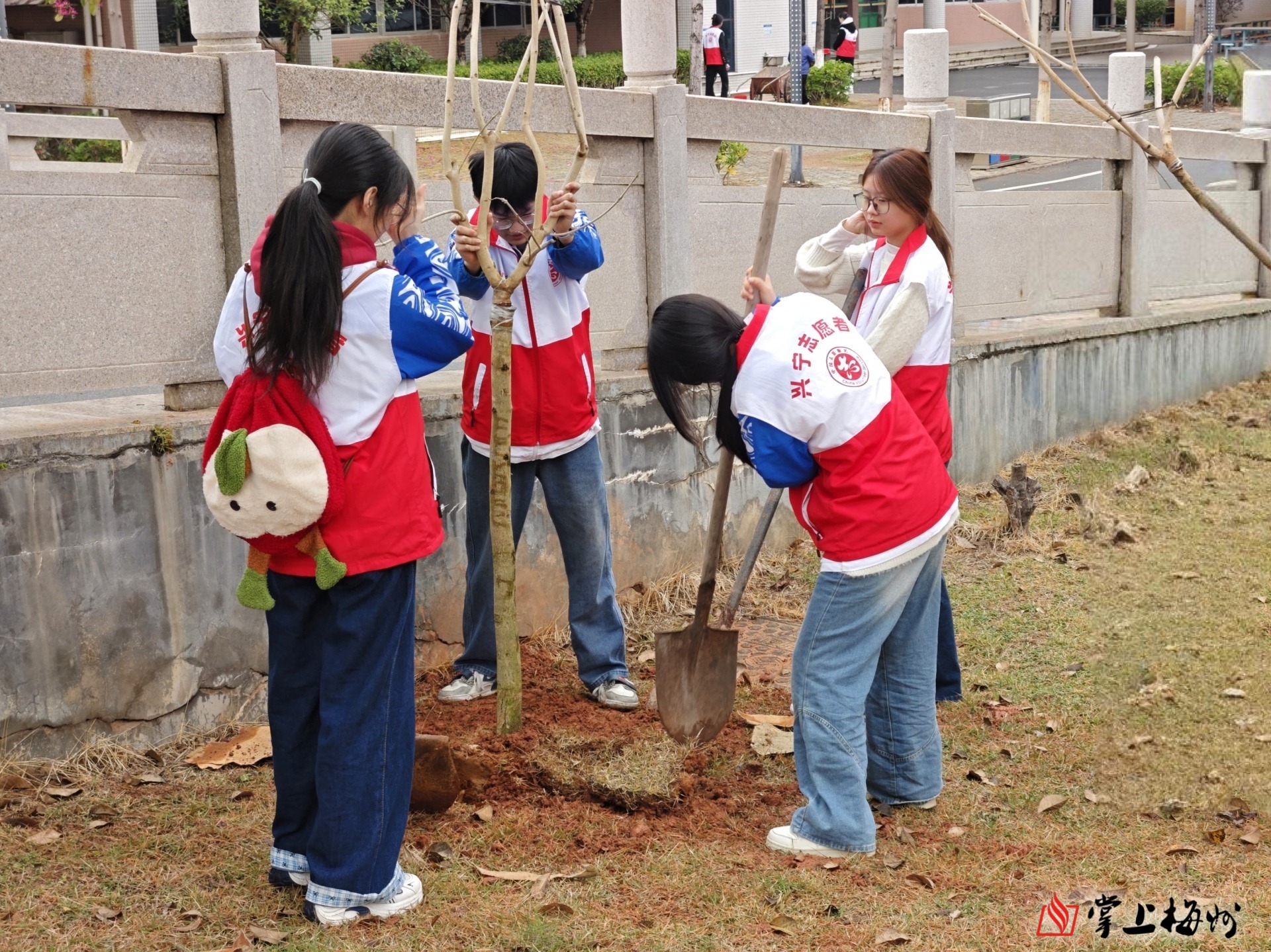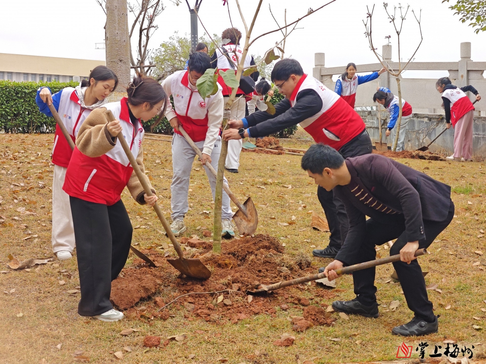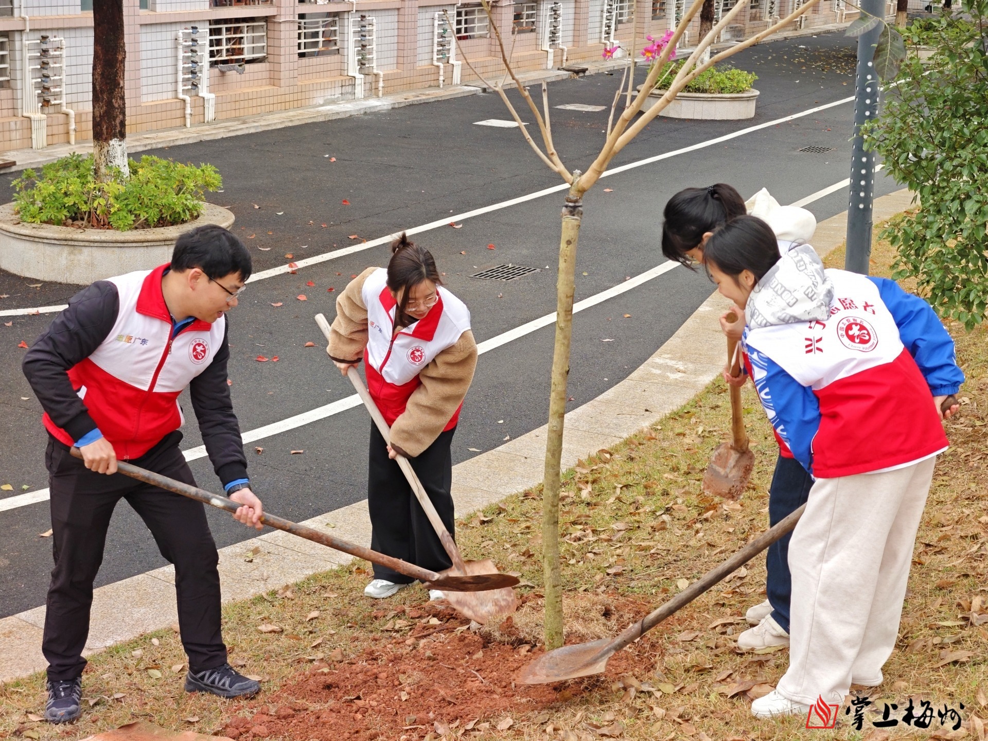 植树现场,青年们化身“爱绿使者”,大家分工协作、默契配合,挥锹铲土、扶苗定根、提水浇灌,齐心协力栽下20余株紫花风铃木苗和杜鹃树苗。一片承载校地情谊、彰显青春担当的“青年林”在此落地生根、向阳生长,为兴宁大地增添一抹亮眼的“志愿红”和“生态绿”。