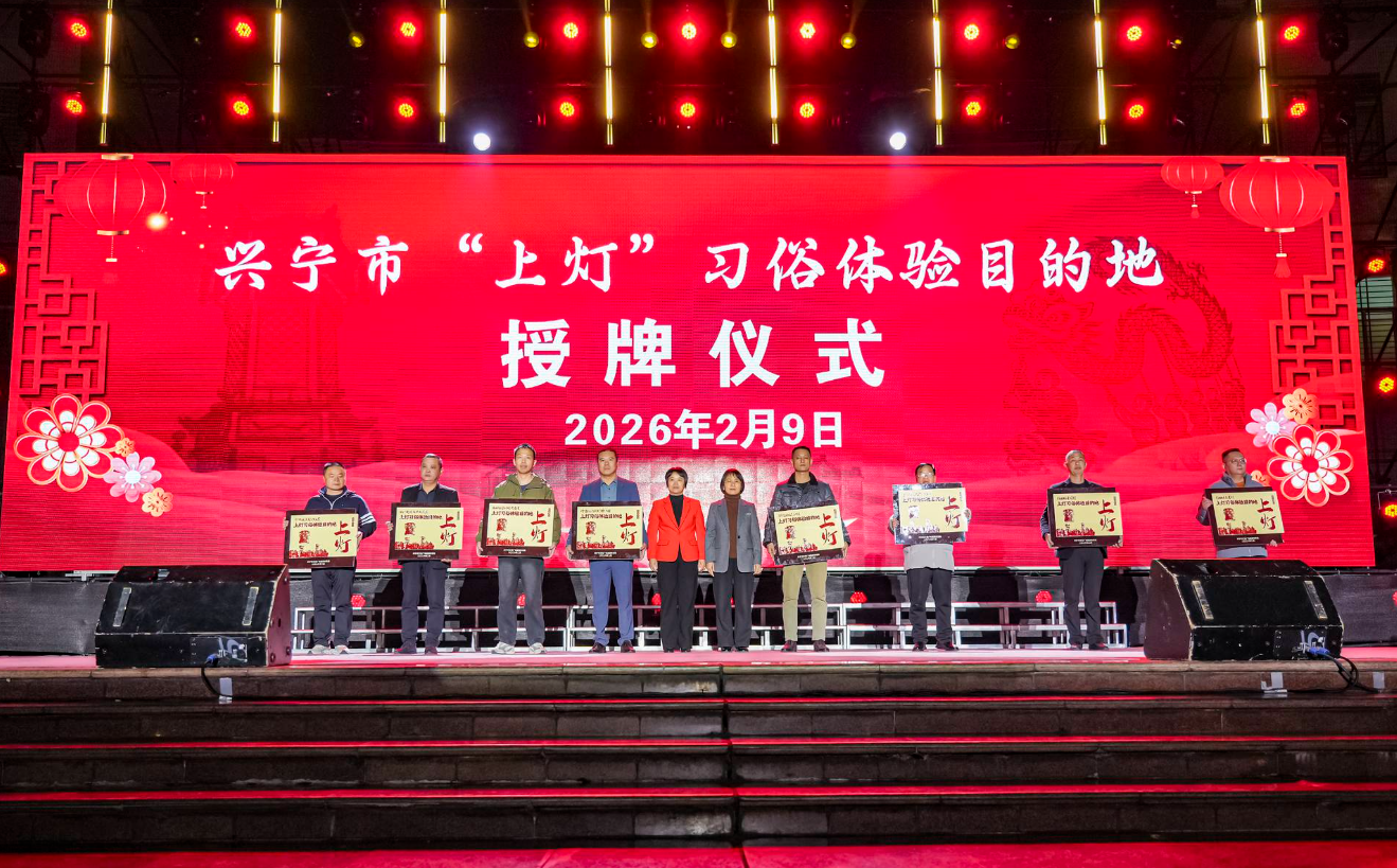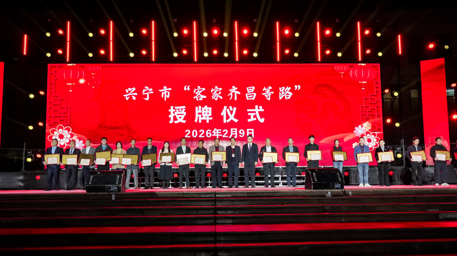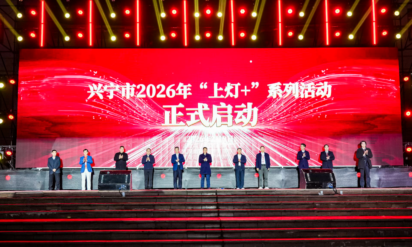 晚会现场,广东财经大学党委副书记、校长童士清,省委网信办原副主任曾胜泉,梅州市人大常委会副主任、市总工会主席张达宏,梅州市政协副主席陈元星,广州市天河区农业农村局局长欧阳习中,北京广东企业商会会长、北京金港建设股份有限公司总经理李东浩,广东省兴宁商会会长、深圳市红犇资本管理有限公司董事长黄雅敏,兴宁市政协港澳委员张宏基,中共兴宁市委书记罗达祥,中共兴宁市委副书记、市长赵超文,省级非遗项目“兴宁上灯”传承人罗志平等11位领导嘉宾共同按触大屏幕启动了兴宁市2026年“上灯+”系列活动。晚会上,宣布了兴宁市“上灯”习俗体验目的地名单和“客家齐昌等路”评选结果,并进行授牌,还发布了全新“上灯”IP形象。