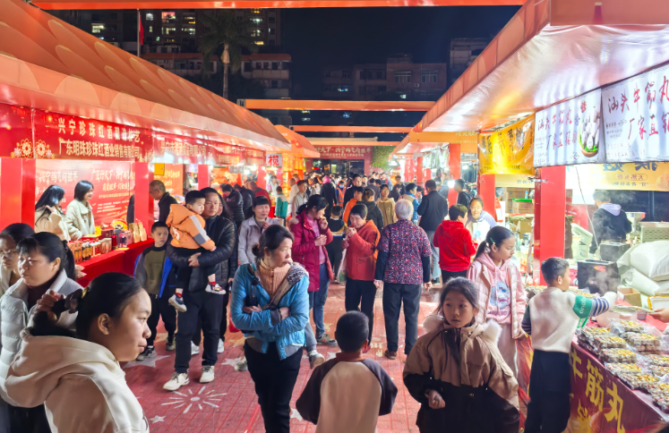 晚会现场旁边,于2月4日开幕的“广货行天下·兴宁鸽飞向世界”暨“商贸旺市·灯会佳年”——兴宁市2026年农文旅融合市集活动正在火热开卖。市民在观看演出期间,还走进市集现场,参观和选购客家特产或来自各地的特色商品。