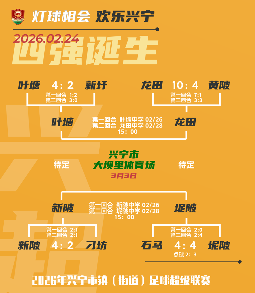 至此,“兴超”联赛四强全部诞生!他们分别是新陂镇队、坭陂镇队、叶塘镇队、龙田镇队。四强集结,半决赛将在2月26日火热开战!半决赛仍采用主客场制进行,广大球迷可以前往“兴超”赛场为他们加油!