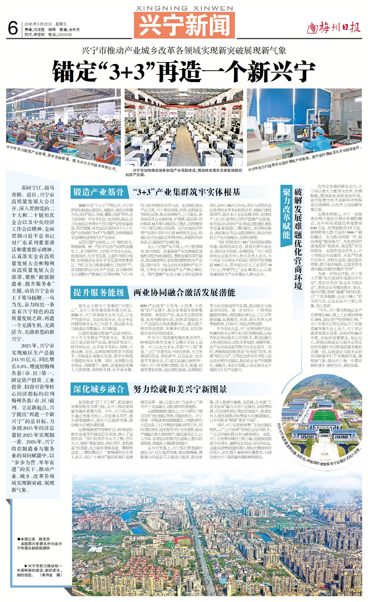 2025年,兴宁市实现地区生产总值241.93亿元、同比增长8.8%,增速居梅州各县(市、区)第一,固定资产投资、工业投资、招商引资等核心经济指标均位列梅州各县(市、区)前列。立足新起点,兴宁提出“再造一个新兴宁”的总目标,力争到2035年经济总量较2025年实现翻一番。2026年,兴宁将在制造业与服务业的双向赋能中,以“步步为营、年年有进”的实干,推动产业、城乡、改革各领域实现新突破、展现新气象。