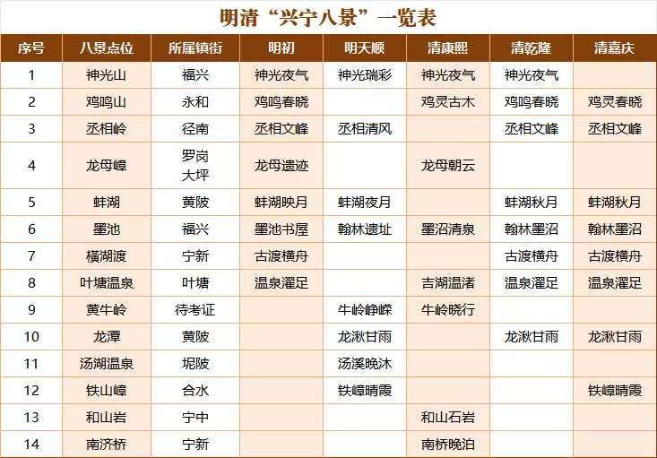 记者了解到,明清时期,兴宁市就先后进行过五次“八景”评选,县内14处风景名胜先后入选,形成了深厚的文化积淀。自明正德十一年(1516)首次评选“八景”起,兴宁八景文化距今已有500余年历史,而最后一次“八景”评选(清嘉庆“八景”)距今也有200余年。随着时代变迁、沧海桑田,兴宁八景在不同历史时期有所变化,反映了兴宁历史文化的演变和自然景观的多样性。