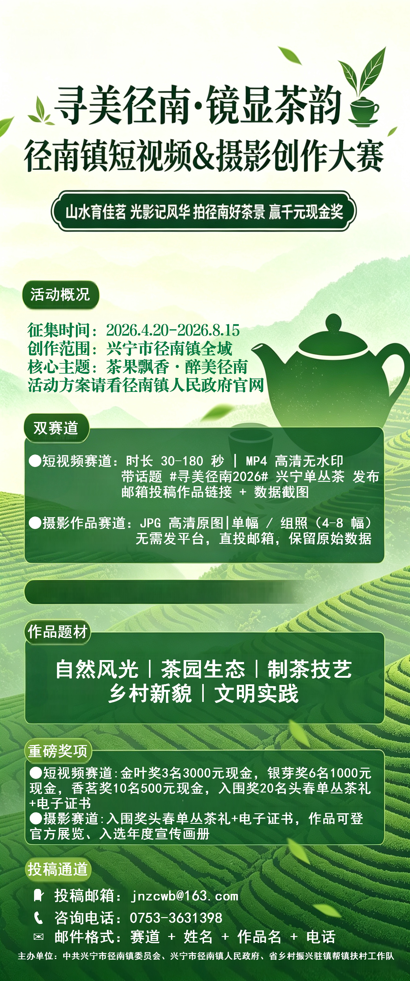 短视频赛道要求作品在抖音、快手、微信视频号或小红书等平台发布,统一带上话题标签#寻美径南2026#、#兴宁单丛茶#。发布时可选择一个或多个平台,以传播数据最高的平台为准。参赛选手需在8月15日前将作品链接及数据截图(播放量、点赞、评论)报送至邮箱jnzcwb@163.com,邮件标题格式为“短视频投稿+作者姓名+作品名称+联系电话”。视频时长需在30秒至180秒,格式为MP4,横屏、竖屏均可,分辨率不低于1920*1080,画面清晰、声音清楚,无明显杂音、水印、角标。每人或每个团体可提交1至3件作品,多件作品需分别提交,不重复参与评审。