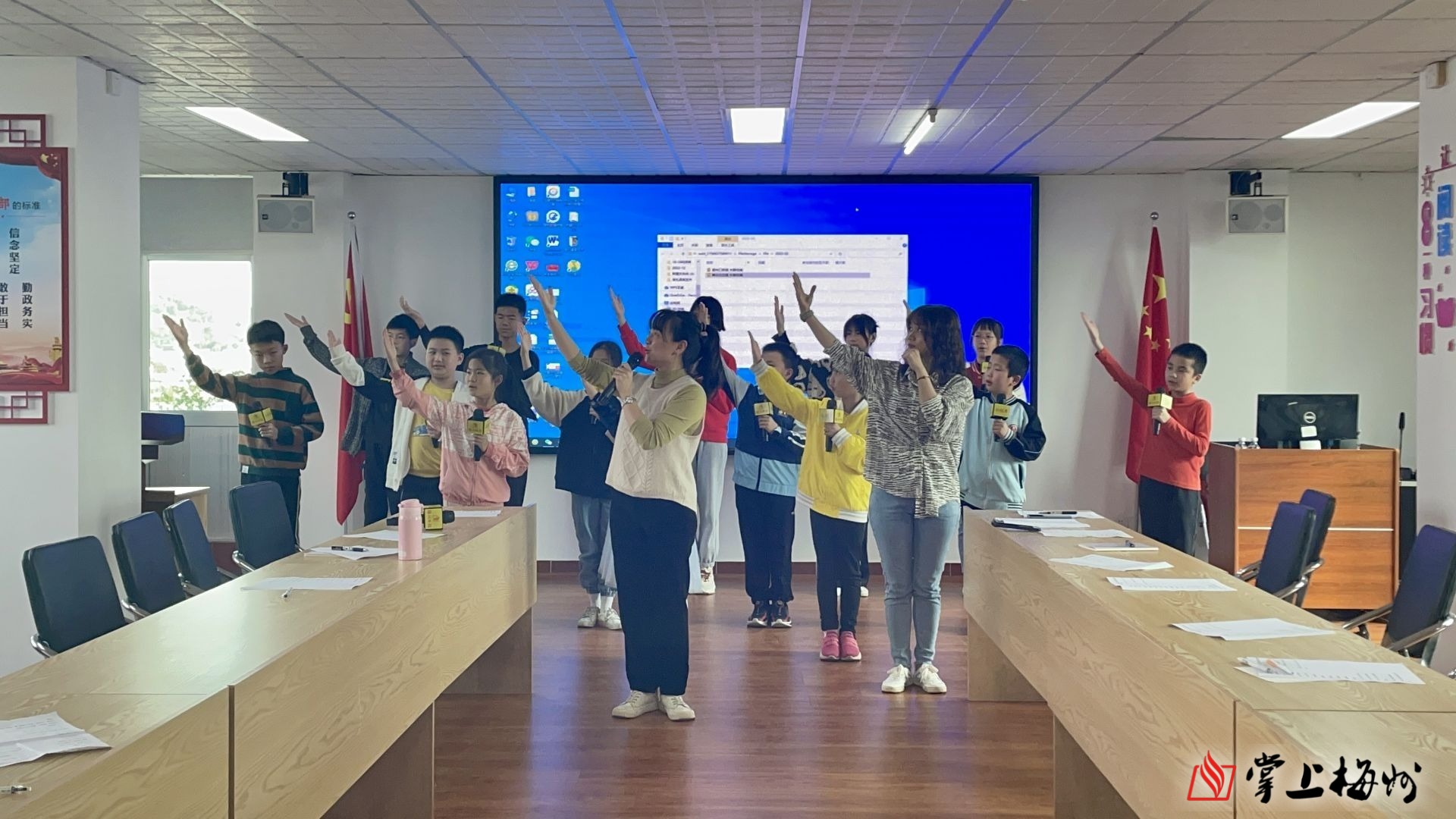 “下面我们来练习右手展示手势,请看这边!”在老师的示范和指导下,同学们站姿笔挺,左手举麦,右手自然地往右侧伸展,做出“请”的手势。这是梅州日报金话筒小主持春季班在梅州日报社开课时的其中一幕。