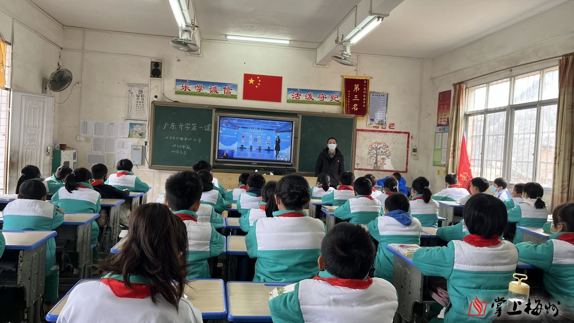 兴宁市大坪中心小学的学生在收看开学第一课。 (黄敬桃 摄)