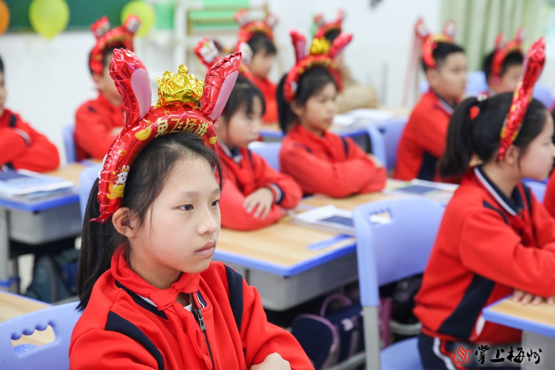 梅州日报小记者站——客都小学的学生们戴上“兔”飞猛进气球。 (吴腾江 摄)