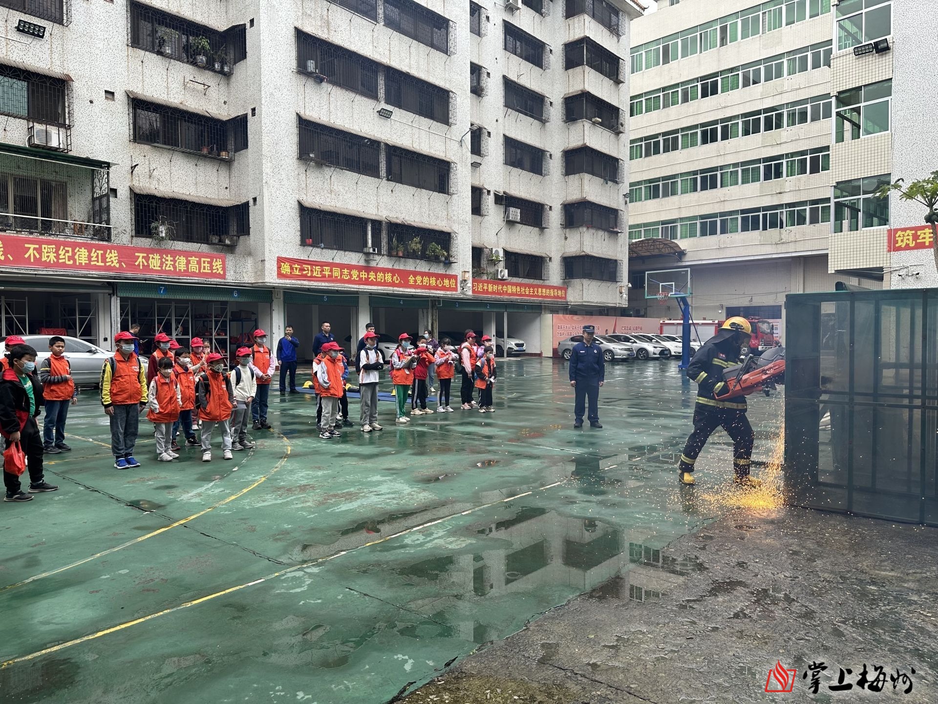 脱下科学家“战袍”,小记者们来到梅江区江南消防救援站,化身“小小消防员”。为让小记者近距离了解消防员的工作状态,救援站的消防员手持电锯“整装待发”,给小记者带来了一场消防演练,“还原”火场中“破门而入”的现场。“消防员在极短的时间内,可以将这块一厘米厚的钢板锯出一个能容纳手臂通过的三角形缺口,方便消防员在救火时能把手伸进去开门,救出门里被困的人员。”救援站指导员一丝不苟地跟小记者作详细讲解。