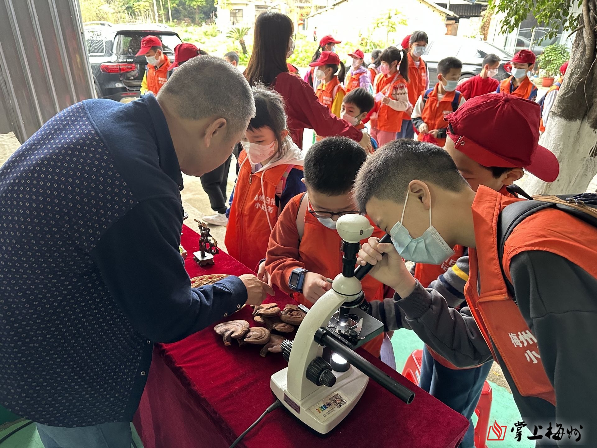 活动的首站,小记者们走进梅州市华康生物有限公司,在工作人员的指导下,学习如何使用显微镜,并通过显微镜观察灵芝孢子粉。“我看到了!是褐色,像鸡蛋一样的椭圆形。”看着在显微镜下呈现出的另一种形态的灵芝孢子粉,小记者汪缜润倍感神奇,不禁兴奋地与其他小记者分享。他的分享也引起了其他小记者的好奇心,纷纷上前操作显微镜,亲眼“见证”着科学家眼中的奇妙生物现象。