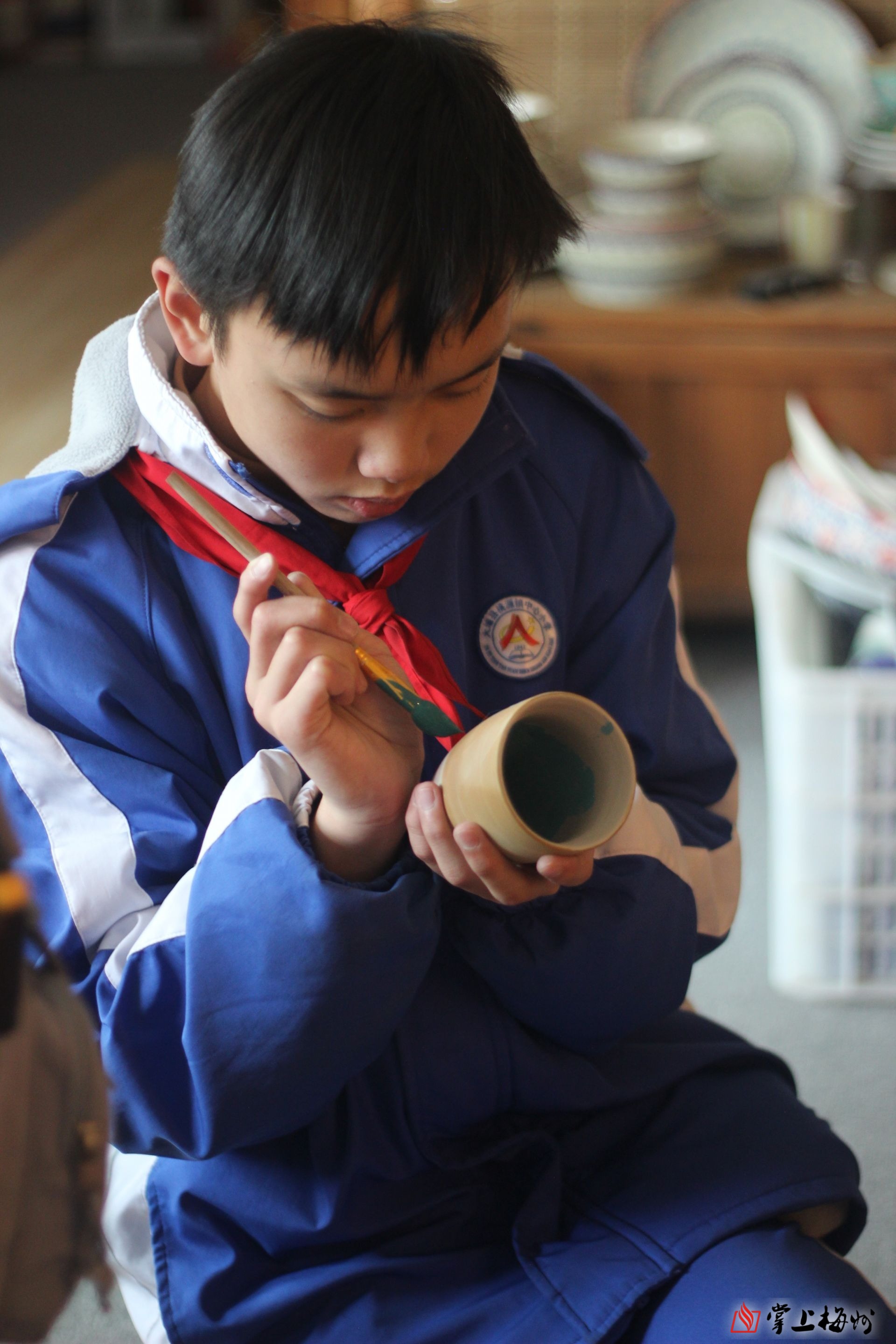 看到小记者们对陶瓷表现出的喜爱之情,工作人员提出让大家都体验一把陶瓷绘画的过程,听到这样有趣的提议,小记者们都不禁雀跃起来。在工作人员的指导下,小记者们选择好各自想要绘画的陶瓷制品之后,三五成群地围坐在一起,共享画笔与颜料,拿起手中尚未着色的陶瓷杯或陶瓷盘,一笔一画地细细涂画出心中想要的图案。小记者们一边绘画,一边畅聊自己的作品构想,相互讨论要把画好的作品赠送给哪位家人或是好友,一时之间,欢声笑语洋溢在屋子里。