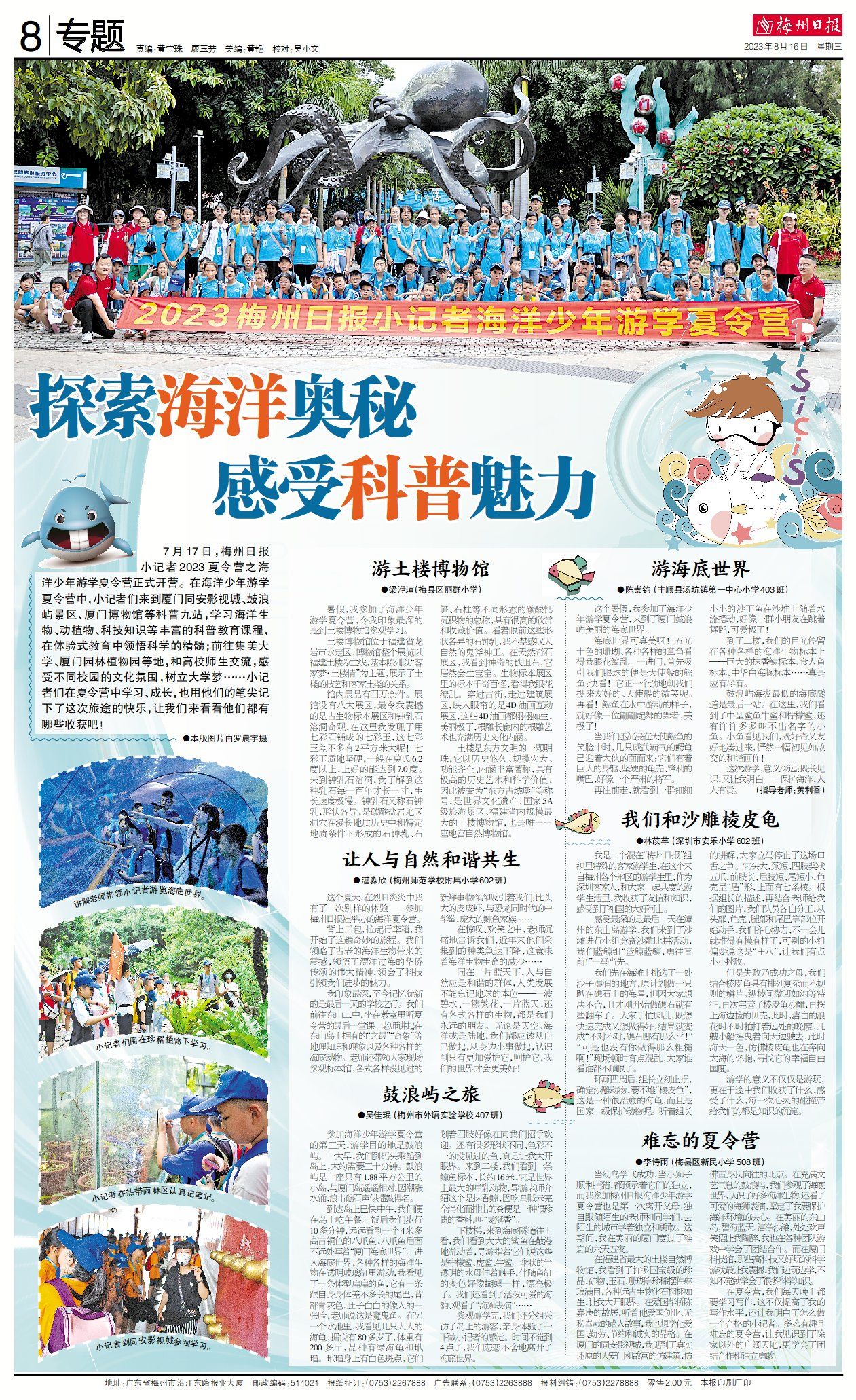 7月17日,梅州日报小记者2023夏令营之海洋少年游学夏令营正式开营。在海洋少年游学夏令营中,小记者们来到厦门同安影视城、鼓浪屿景区、厦门博物馆等科普九站,学习海洋生物、动植物、科技知识等丰富的科普教育课程,在体验式教育中领悟科学的精髓;前往集美大学、厦门园林植物园等地,和高校师生交流,感受不同校园的文化氛围,树立大学梦……小记者们在夏令营中学习、成长,也用他们的笔尖记下了这次旅途的快乐,让我们来看看他们都有哪些收获吧!