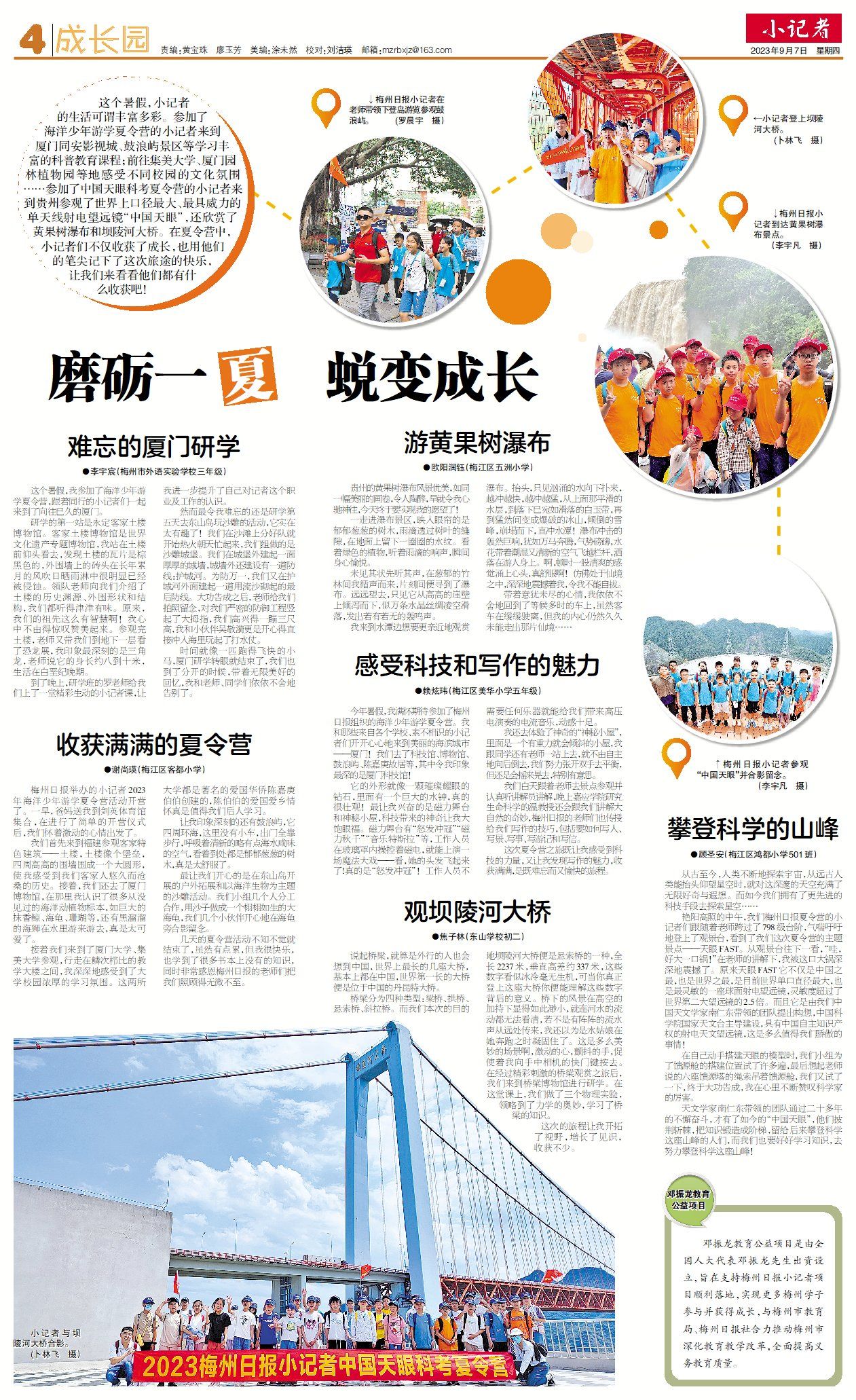这个暑假,小记者的生活可谓丰富多彩。参加了海洋少年游学夏令营的小记者来到厦门同安影视城、鼓浪屿景区等学习丰富的科普教育课程;前往集美大学、厦门园林植物园等地感受不同校园的文化氛围……参加了中国天眼科考夏令营的小记者来到贵州参观了世界上口径最大、最具威力的单天线射电望远镜“中国天眼”,还欣赏了黄果树瀑布和坝陵河大桥。在夏令营中,小记者们不仅收获了成长,也用他们的笔尖记下了这次旅途的快乐,让我们来看看他们都有什么收获吧!