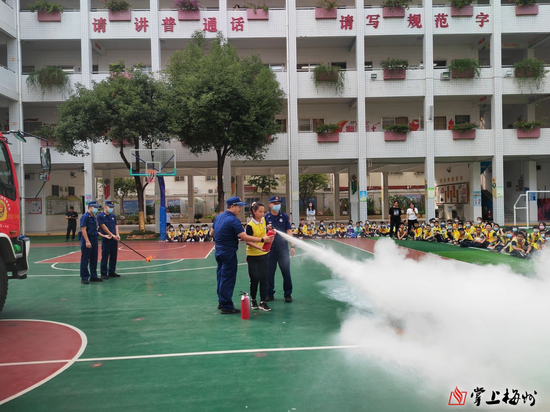 梅江区美华小学学生在消防员指导下学习使用灭火器。