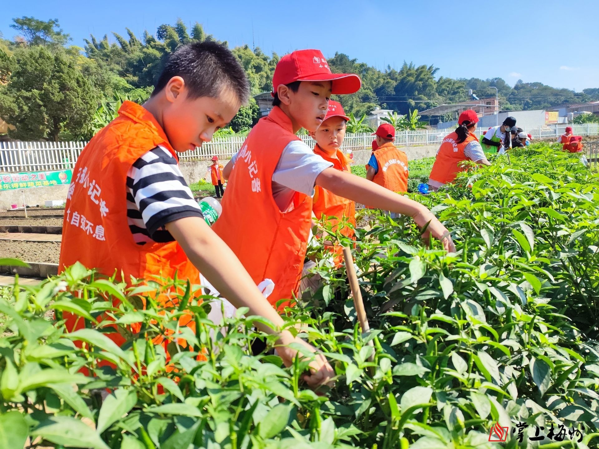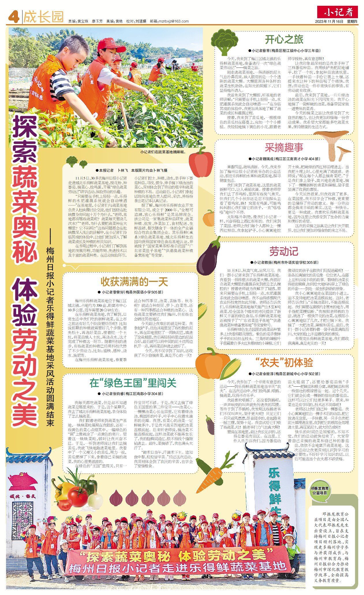 11月5日,30多名梅州日报小记者走进城北乐得鲜蔬菜基地,授花粉、种番茄、摘菜心、捡鸡蛋,开展“绿色蔬菜劳动记”研学活动,体验劳动的乐趣。