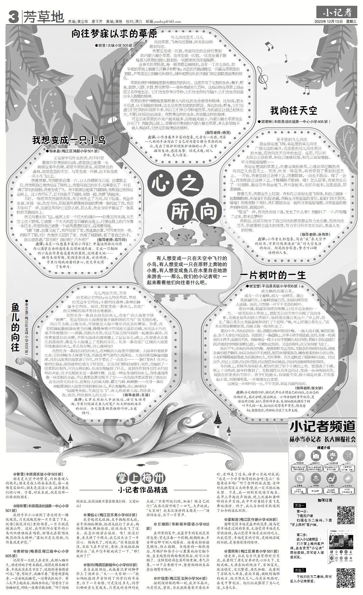 有人想变成一只在天空中飞行的小鸟,有人想变成一只在原野上奔驰的小鹿,有人想变成鱼儿在水里自在地游来游去……那么,我们的小记者呢?一起来看看他们向往着什么吧。